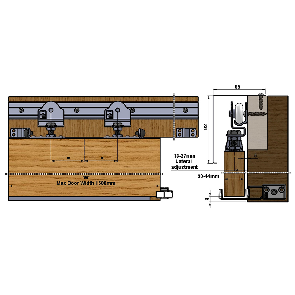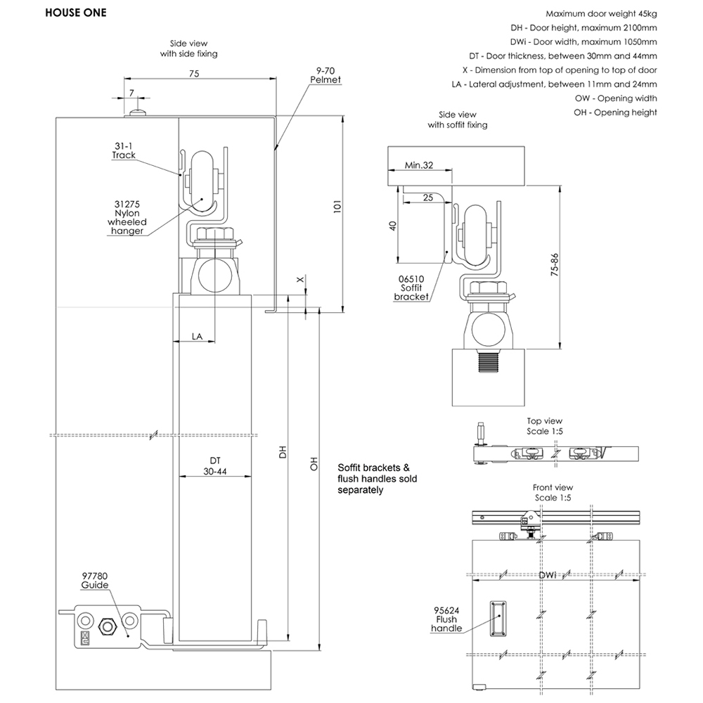 House One is a top hung sliding system for room entrance doors. This quiet system needs virtually no maintenance. It is effortless to operate and highly durable. Please note that doors are not included.