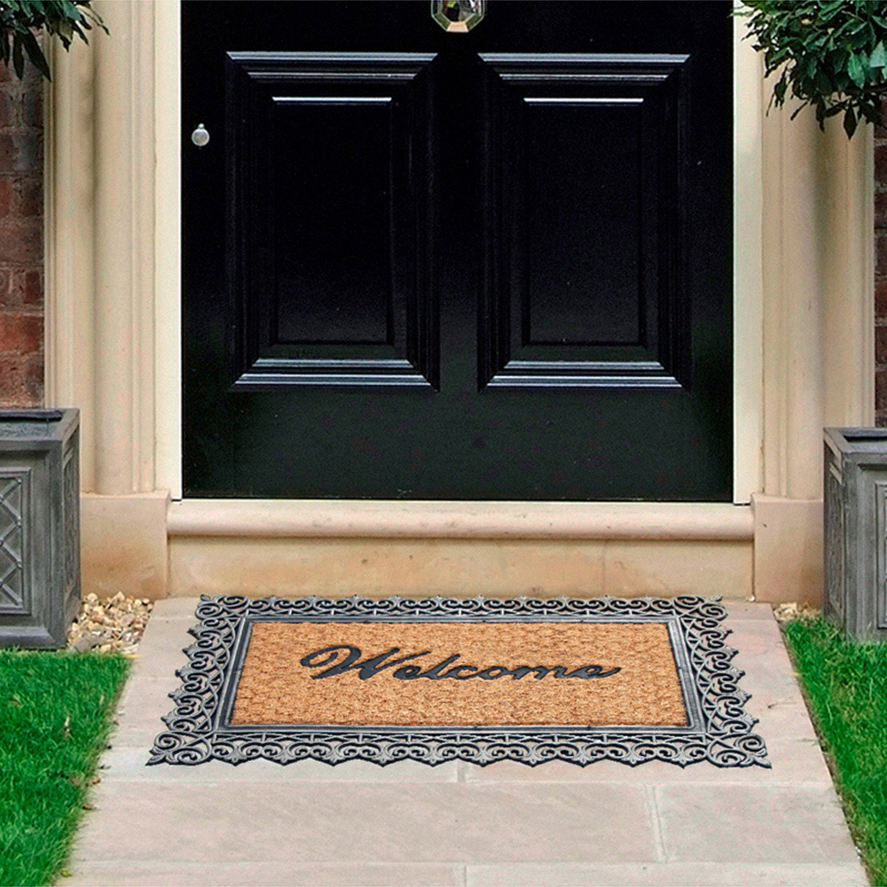 Moulded from rubber, the trim has a filigree cut-out effect inspired by the iron gates which stand at the entrances of secret gardens. This welcome doormat exudes regal class, making a bold style statement indoors or outdoors in any home. This indoor and outdoor mat is made from natural coir bristles, which come from coconut fibre. It is eco-friendly and durable, making it ideal for workplaces, potting sheds, conservatories and other entrances. The mat is thick and has a ridged surface that helps clean dirty shoes without being bulky. It is highly absorbent and built to last for everyday use.