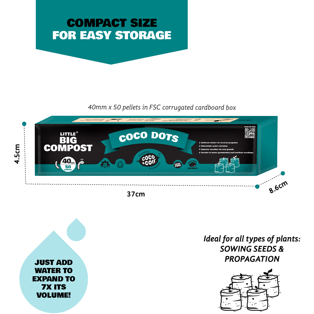 40mm Coco Dots netted coir pellets are perfect for starting off seeds. Each pellet is wrapped in a protective net that holds the compost in place during and after expansion. Simply place them in a pot or tray with water and watch the coir plug plants expand!