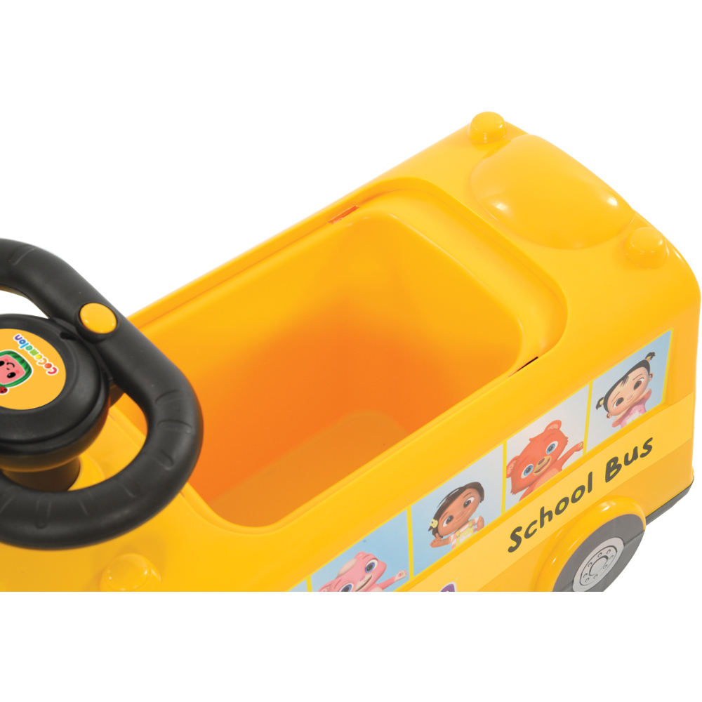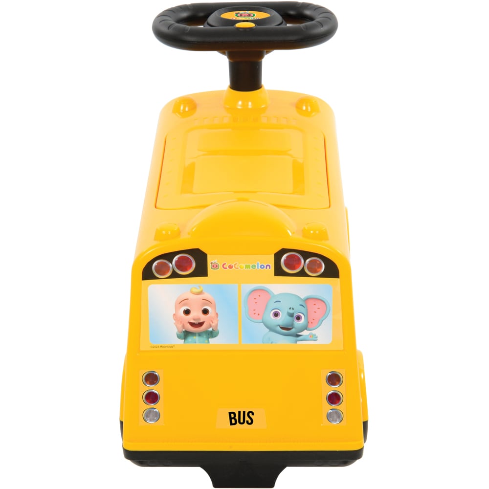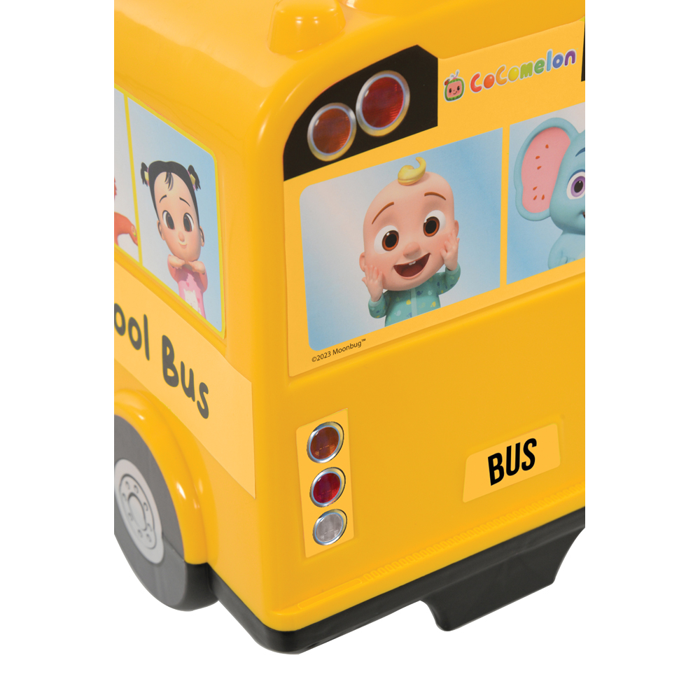 Get on the move with this realistic CoComelon School Bus Ride On featuring character favourites JJ, Cece, Ms Appleberry, Cody and Ello! Perfect for little ones finding their feet, this ride-on is not only designed for comfort with its moulded seat and smooth steering wheel but safety also with an in-built anti-tip feature and puncture-proof wheels which provide stability and grip! The rotational wheels make steering easy while the under-seat storage is perfect for adventuring with your teddies. To top it off, press the steering wheel button to listen to catchy, sing-a-long nursery rhymes which make this product perfect as a beginner's ride-on. Dimensions: H 52 x W 23 x L 54cm.