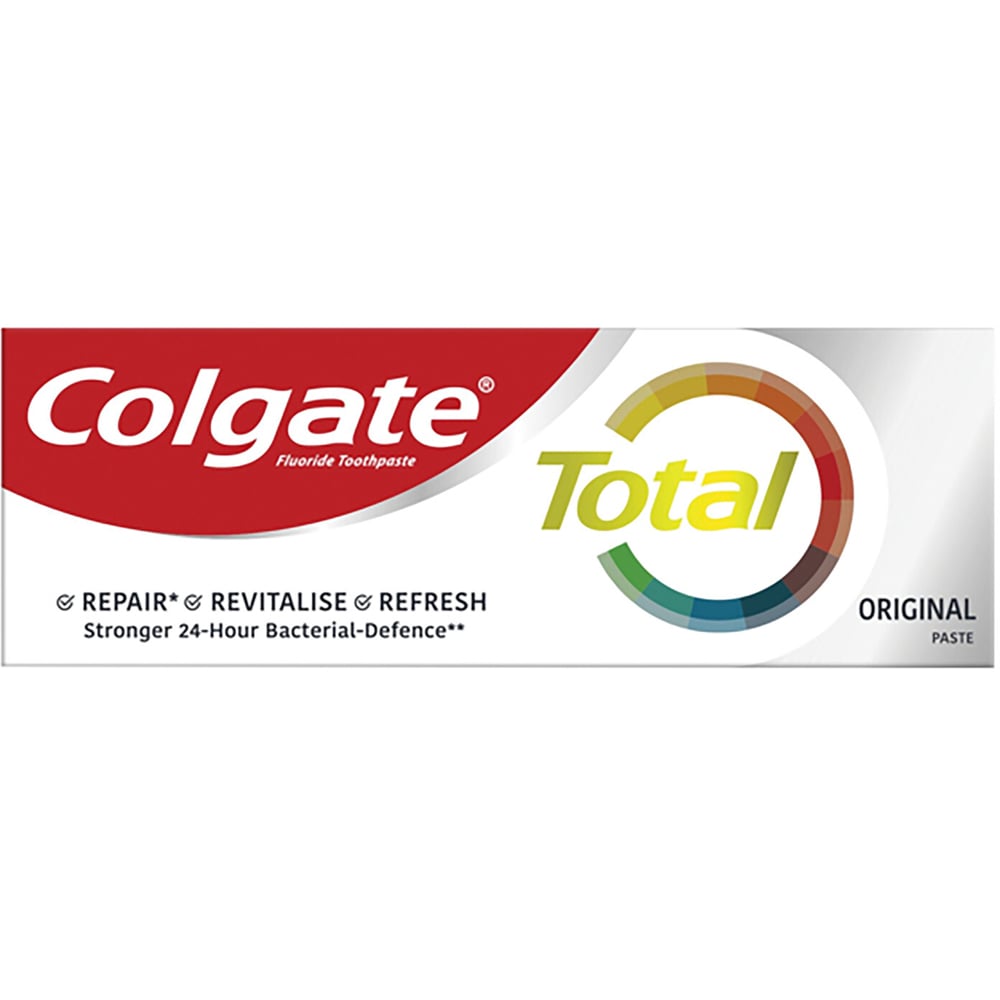 Get strong around-the-clock bacterial defence with this Colgate Total Original Toothpaste. It is designed to protect against cavities, remove plaque, revitalise gums, and strengthen the enamel for a brighter smile. It also helps to reduce tartar and protect and whiten sensitive teeth, while giving you a fresh breath. Packed in a recyclable tube, it's ideal for the entire family. Size: 20ml.