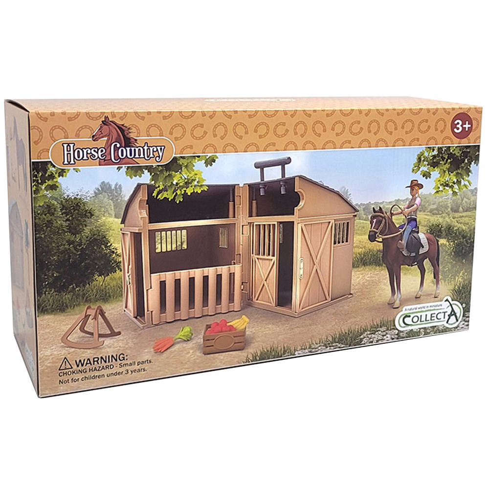 Indulge your animal-loving tots with the CollectA Rider and Accessories with Horse and Stable Box Set. This comprehensive set includes a stable with two rooms featuring bar windows, a rider adorned with a cowgirl hat, riding vest, and boots, and a horse boasting a stunning bay coat. It also comes with accessories such as a saddle, stirrups, and bridle with reins, plus a basket of toy fruit and veggies for the horse to enjoy. Hand-painted for realism, the horse toy is designed by experts to be factually accurate and true to life. Suitable for children of age 3 and above.