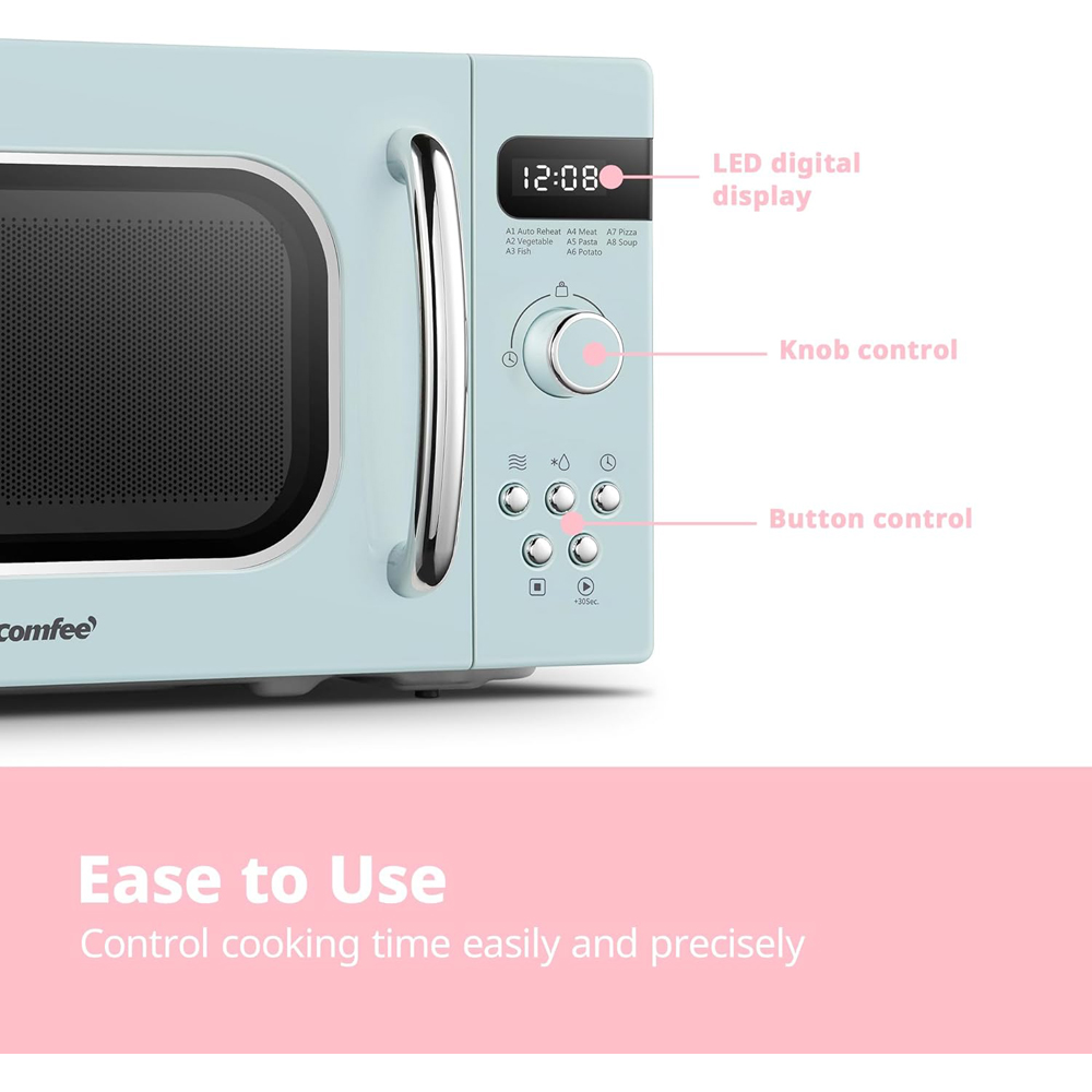 This retro-style microwave (Interior: 30.6 x 30.4 x 20.5cm / 20L / 800W) features a Macaron-coloured exterior blending vintage aesthetics with modern technology. Equipped with an LED digital display, 8 preset menus, and 5 power levels, it handles defrosting, reheating, and cooking effortlessly. Key functionalities include a child safety lock, rapid heating technology, one-touch start, and interior lighting. Its intuitive knob controls streamline operation, making this compact appliance an efficient and stylish solution for small kitchens, combining practicality with decorative appeal.
