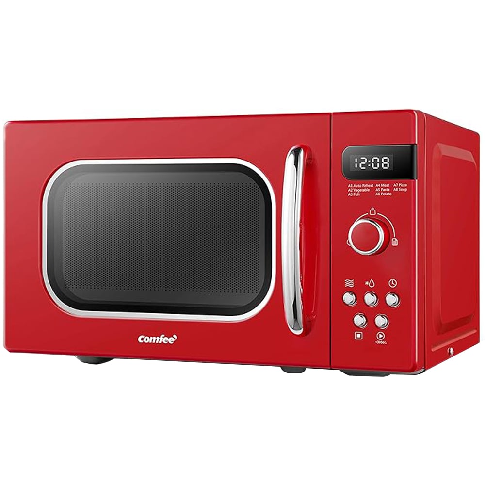 This retro-style microwave (Interior: 30.6 x 30.4 x 20.5cm / 20L / 800W) features a Macaron-coloured exterior blending vintage aesthetics with modern technology. Equipped with an LED digital display, 8 preset menus, and 5 power levels, it handles defrosting, reheating, and cooking effortlessly. Key functionalities include a child safety lock, rapid heating technology, one-touch start, and interior lighting. Its intuitive knob controls streamline operation, making this compact appliance an efficient and stylish solution for small kitchens, combining practicality with decorative appeal.