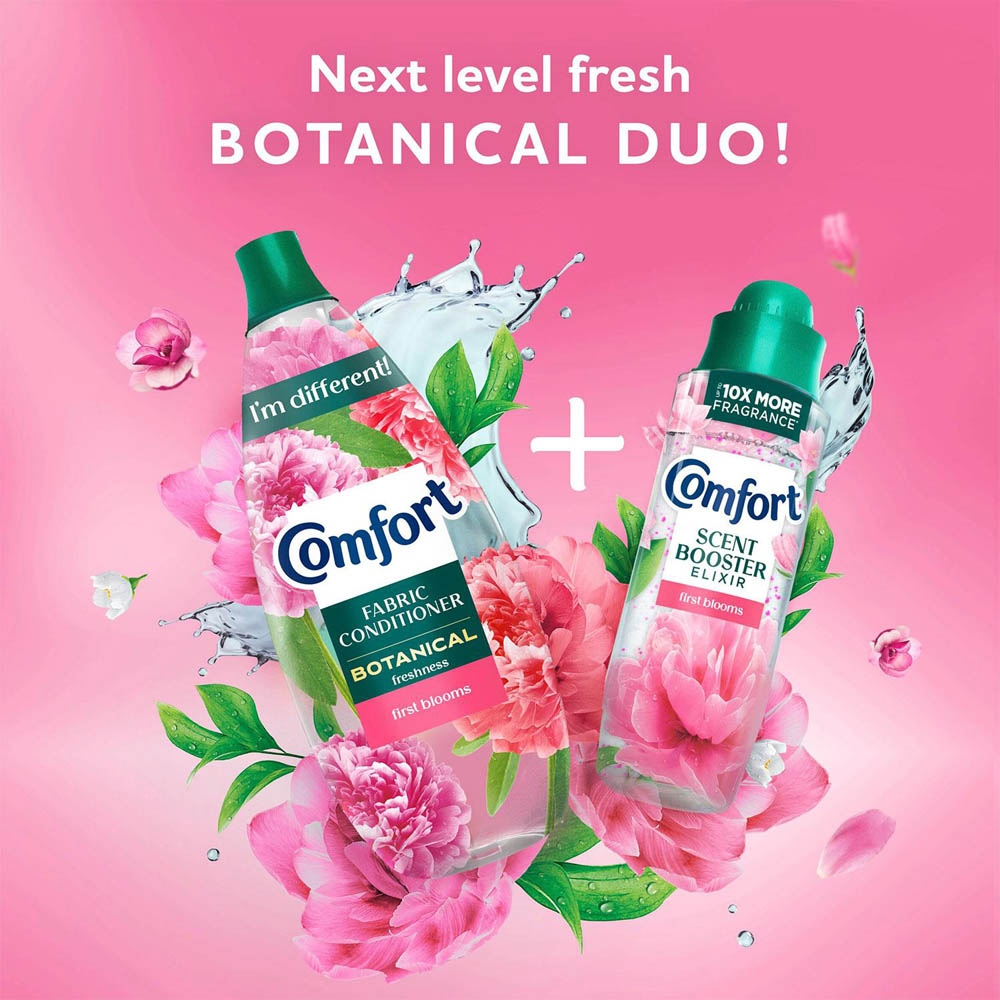Revolutionise your laundry experience with Comfort Botanical Elixir First Blooms Bead-Infused Scent Booster, designed to infuse your clothes with a delightful botanical freshness. This innovative formula, enriched with essential oils and a captivating blend of rose petals, bergamot, and lily of the valley, ensures your garments smell fresh for longer. Even in short and cold wash cycles, it leaves no residue and offers up to ten times more fragrance. Eco-friendly with 93% biodegradability, this scent booster is a perfect addition to your washing routine, ensuring everyday moments are uplifted by nature-inspired, long-lasting freshness.
