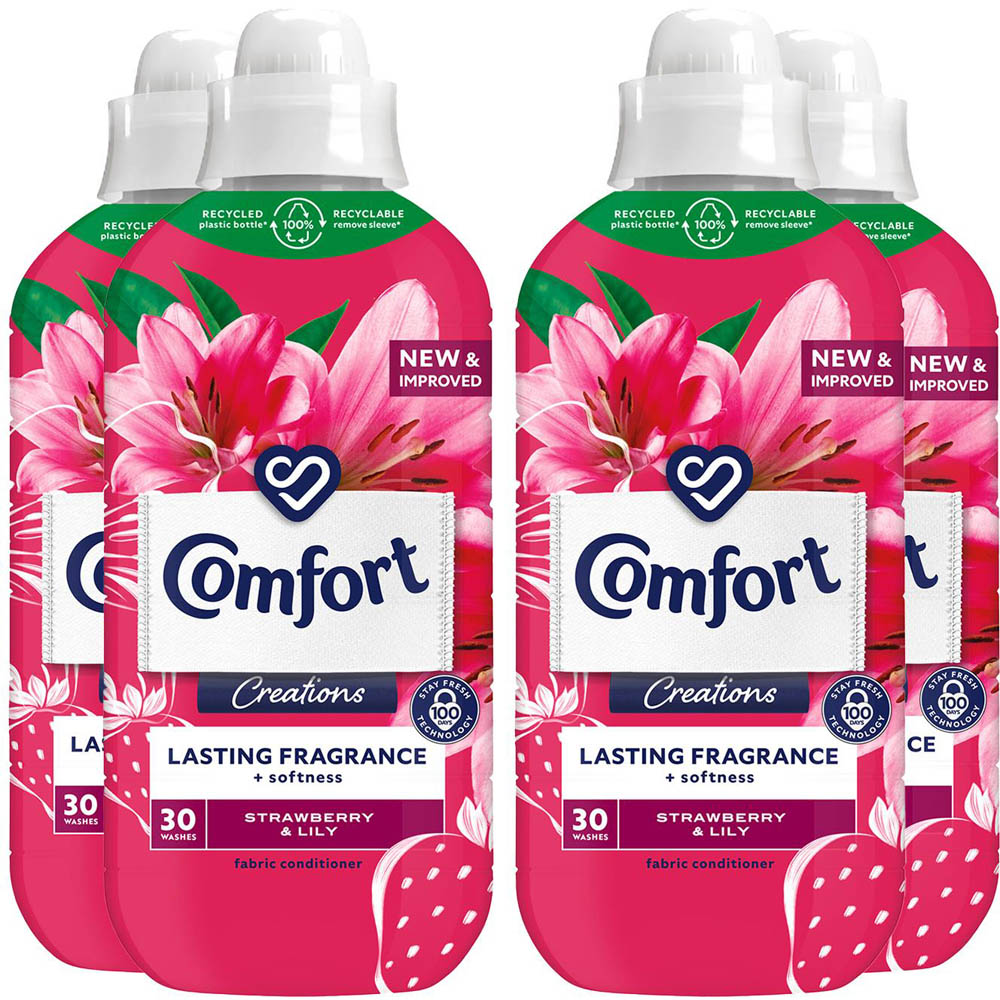 Comfort Creations Fabric Conditioner Strawberry and; Lily, 30 wash - 900ml, 4Pack. We know you love your clothes. We love clothes too, and we want to help you care for them. That's why we have developed Comfort Creations Strawberry & Lily Fabric Conditioner to keep clothes fragrant and clean long after each wash. This fabric softener features Stay Fresh technology, designed to lock in fragrance, to deliver 100 days of freshness and fragrance. This fabric softener features a long-lasting fragrance combining luscious strawberry and a floral lily with sweet vanilla undertones to leave your clothes smelling fragrant and clean. The Comfort Fabric Conditioner bottle is made of 100% recycled plastic and is 100% recyclable. Features: Enjoy 100 days of freshness and fragrance with Comfort Creations Strawberry; Lily Fabric Conditioner Comfort features Stay Fresh technology which is designed to lock in fragrance, giving clothes 100 days of freshness This Strawberry & Lily fabric softener leaves your clothes with sensational long-lasting fragrance notes of luscious strawberry and a floral lily with a sweet vanilla base Let our fabric conditioner wrap you in a strawberry sundae of scents, combining juicy strawberries and lush florals and adding a scoop of fresh, fruity sweetness to your day Let the fresh fragrance bursts of Comfort Fabric Conditioner take you to a happy place because when your clothes smell good, you feel good - all day long How to use: Dose straight into your washing machine drawer. Do not pour directly onto fabrics. Wash hands after use. You do not need to dilute. Add Comfort to your wash to help protect your clothes and leave you feeling great inside and outside every day. Ingredients: 5-15%: Cationic Surfactants. & 5%: Perfume, Alpha-Isomethyl Ionone, Citronellol, Coumarin, Hexyl Cinnamal, Linalool, Lactic Acid, Sodium Benzoate Package Contains: 4x Comfort Fabric Conditioner Strawberry and Lily, 30 wash - 900ml.