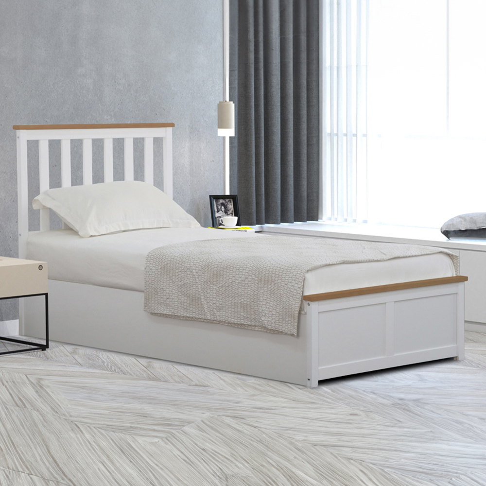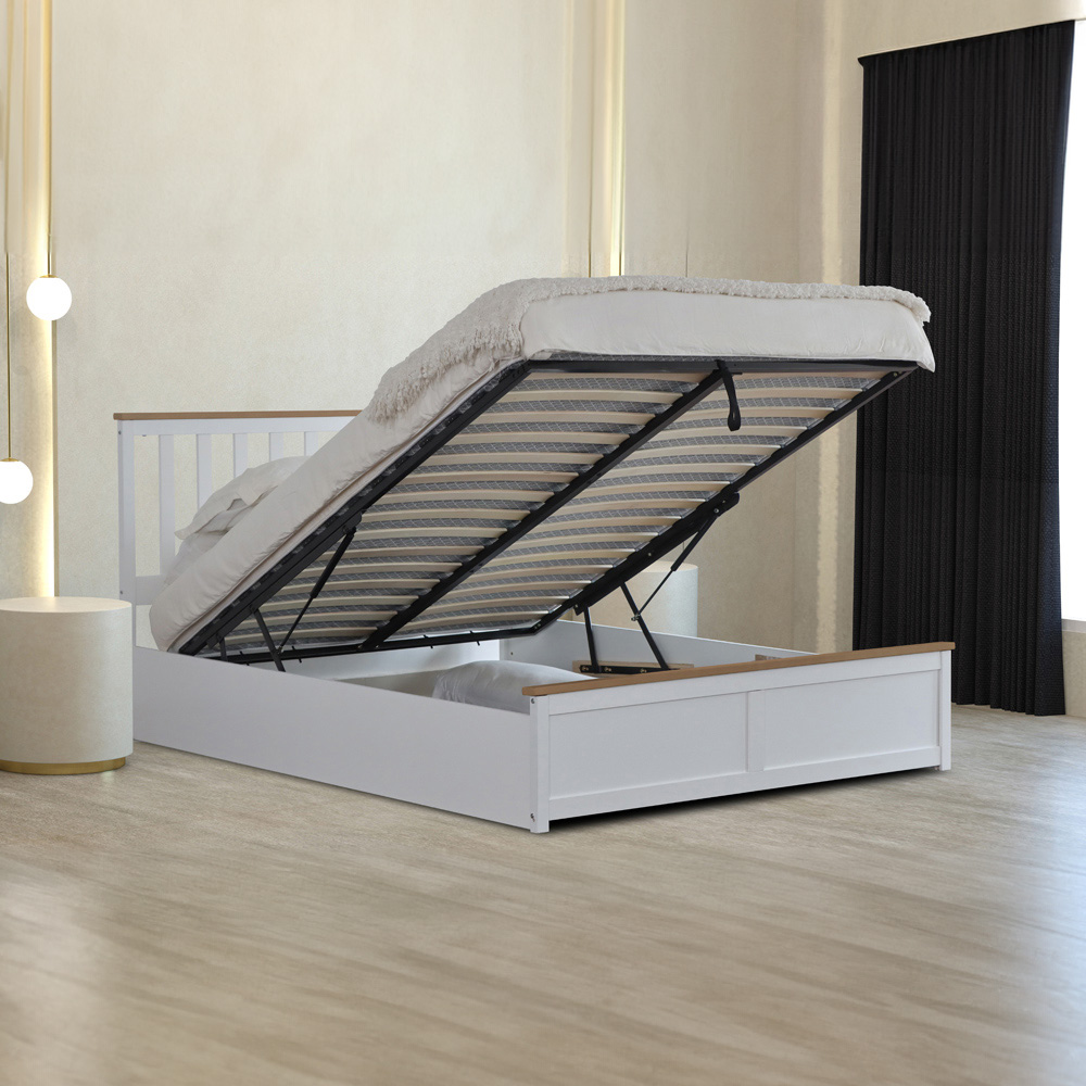 Presenting the Comfy Living Double White Gas Lift Ottoman Bed, a stylish and functional addition to any bedroom. This bed frame boasts a whitewash finish complemented by caramel bars at the head and foot ends, accentuating its elegant design. With a slatted headboard and a low footboard, it offers classic aesthetics while maximising comfort. Equipped with gas hydraulic pistons, this bed provides effortless access to its spacious storage space. It can fit any UK standard 4ft6 size mattress.