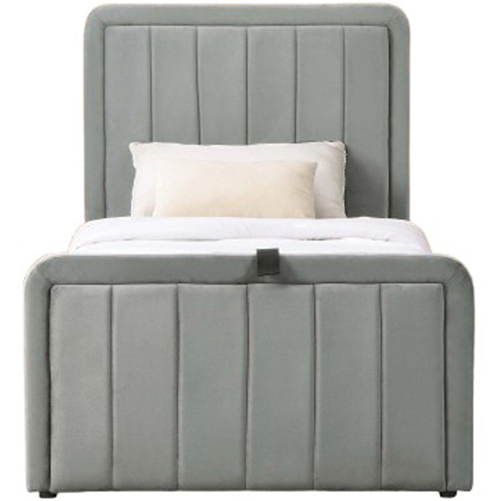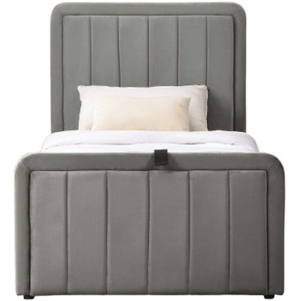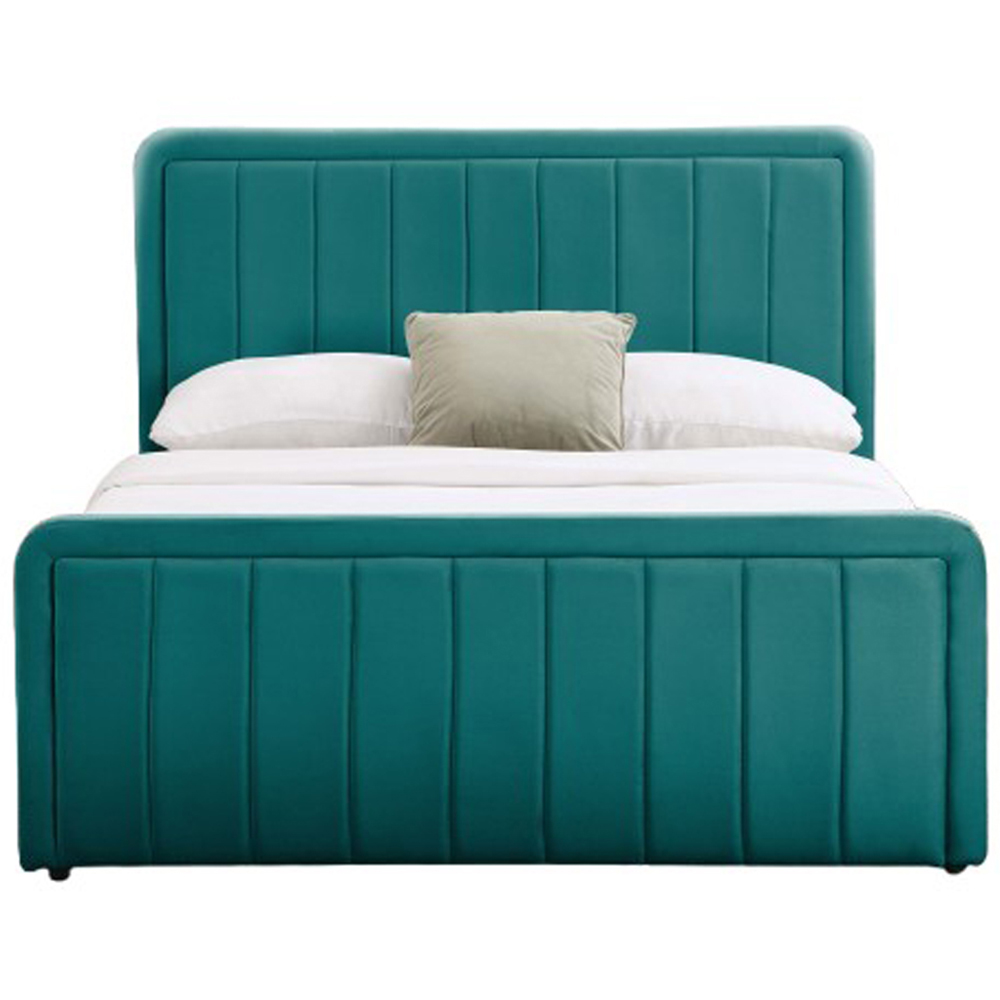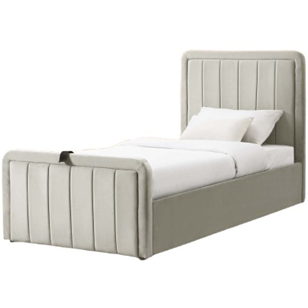 This stylish bed is elegantly upholstered in brushed velvet and features a beautifully detailed padded headboard. Constructed from a solid wooden frame, it includes a sprung slatted base that provides excellent support for the mattress, ensuring you enjoy a fully supportive and comfortable night's sleep. The ottoman design of the bed frame utilises a gas lift mechanism, which lifts the mattress to reveal ample storage space underneath. Please note that all dimensions are approximate, please allow room for slight variations. Dimensions: H109 x W98 x L206cm.