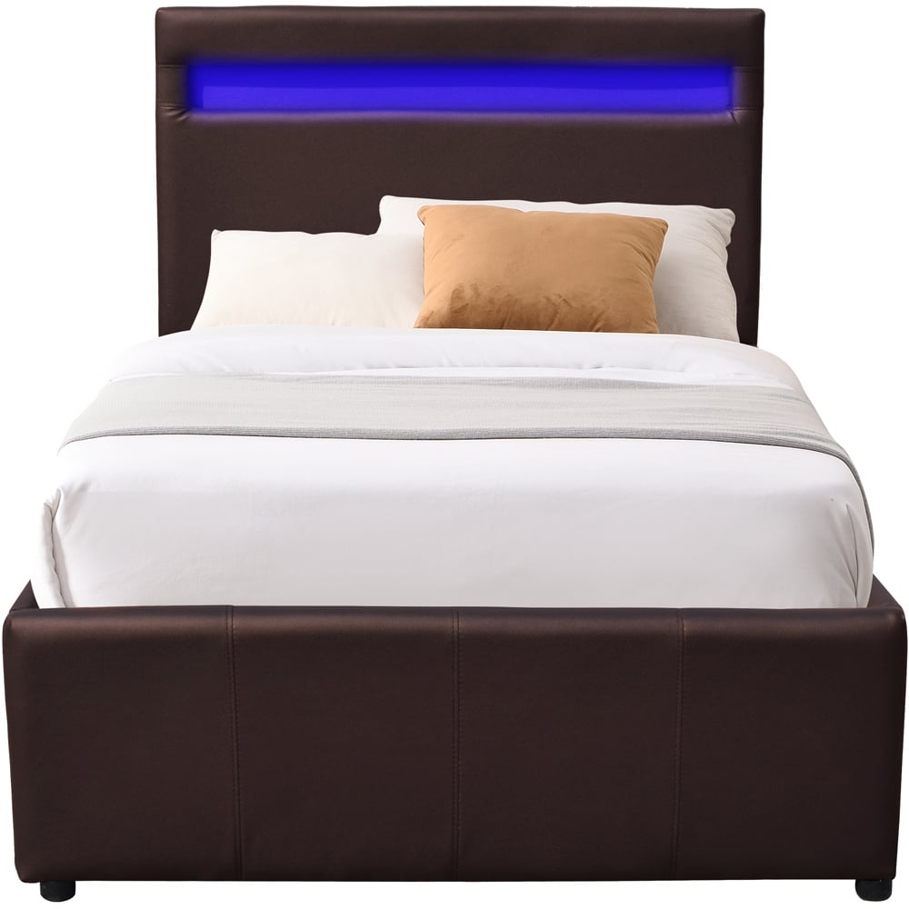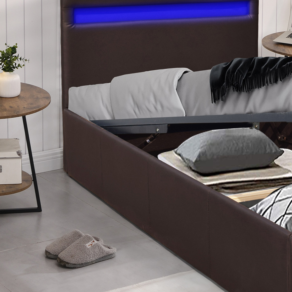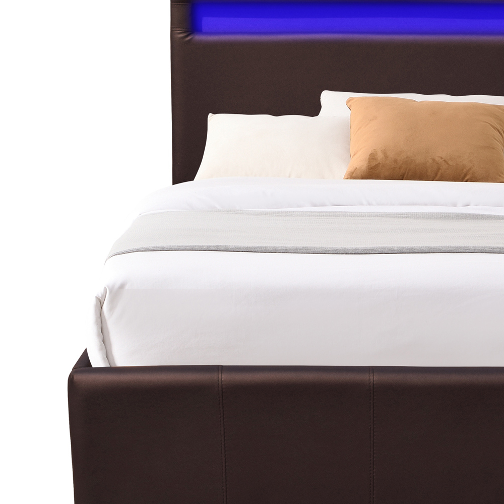 Experience the perfect blend of style and comfort with Comfy Living Small Brown Faux Leather Ottoman Bed Frame With LED. It features a large panelled headboard with stitching detail and a low footboard with understated tapered peg feet. Towards the top of the headboard is an LED colour-changing display which illuminates and flashes a variety of colours, or can be made static on one colour of your choosing. This frame features an innovative storage space under the bed which can be accessed by lifting the metal frame by a fabric handle. The gas hydraulics will enable you to lift with only a slight effort. Please note that this is straight to floor storage.