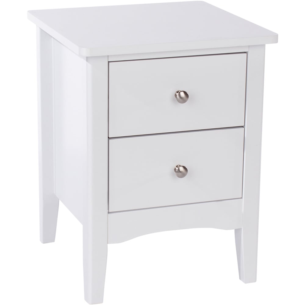 The Como Petite 2 Drawer Bedside Storage Cabinet is perfect for compact spaces. Crafted from MDF, it boasts a sleek white paint finish that is enhanced by sophisticated tapered legs and real metal handles. The drawers effortlessly glide open, thanks to the easy glide drawer runners. The rounded corners not only add a practical touch but also contribute to its overall aesthetic appeal. This cabinet is an excellent choice for keeping your essentials conveniently within reach.