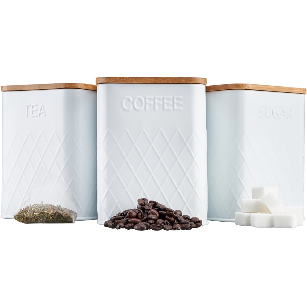 Organise your kitchen with the Cooks Professional 3 Piece White Square Kitchen Storage Set. This stylish set includes tea, coffee, and sugar canisters, each made from durable, powder-coated stainless steel with a sleek, raised diamond pattern and clear labelling. The airtight bamboo lids ensure your essentials stay fresh while adding a modern touch to any kitchen decor. Built to last, these canisters combine practicality with elegance, offering generous storage space without cluttering your countertops. Enjoy peace of mind with a two-year warranty.