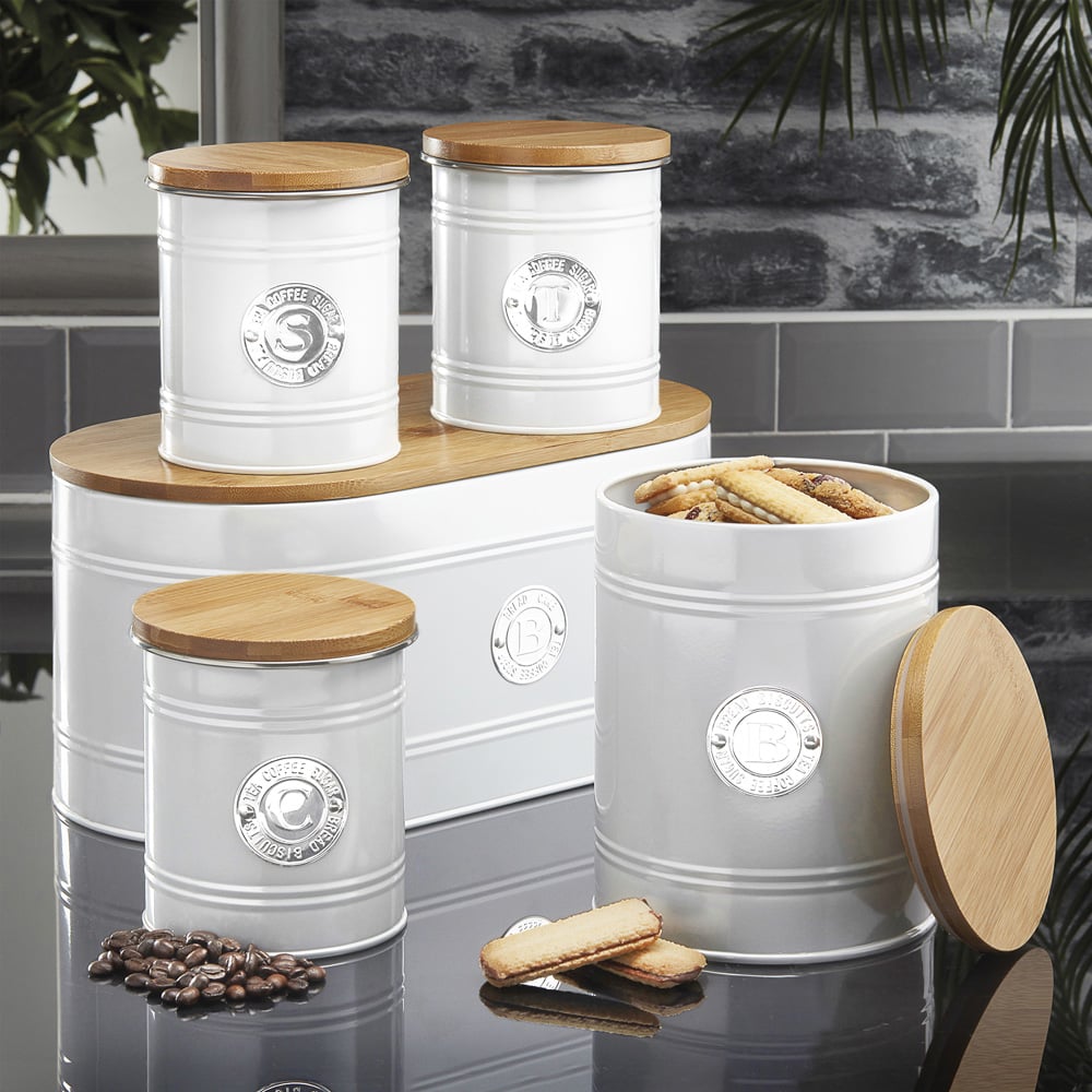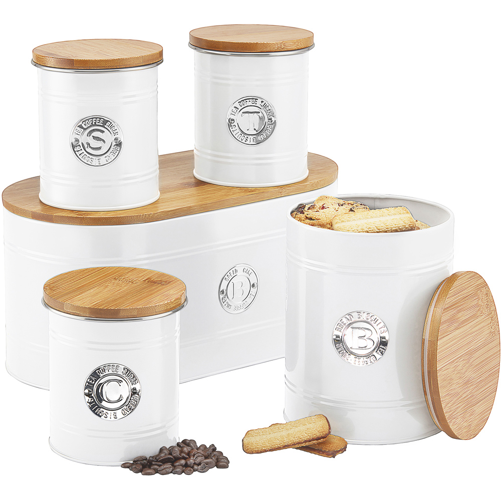 Enhance your kitchen with the Cooks Professional 5 Piece White Storage Set. This set includes a bread bin, biscuit tin, tea, coffee, and sugar canisters, each made from durable powder-coated stainless steel with airtight bamboo lids. The sleek, raised diamond pattern and labels add style and convenience. Designed to fit any kitchen, these containers keep your staples fresh and your counters tidy. Includes a two-year extended warranty.