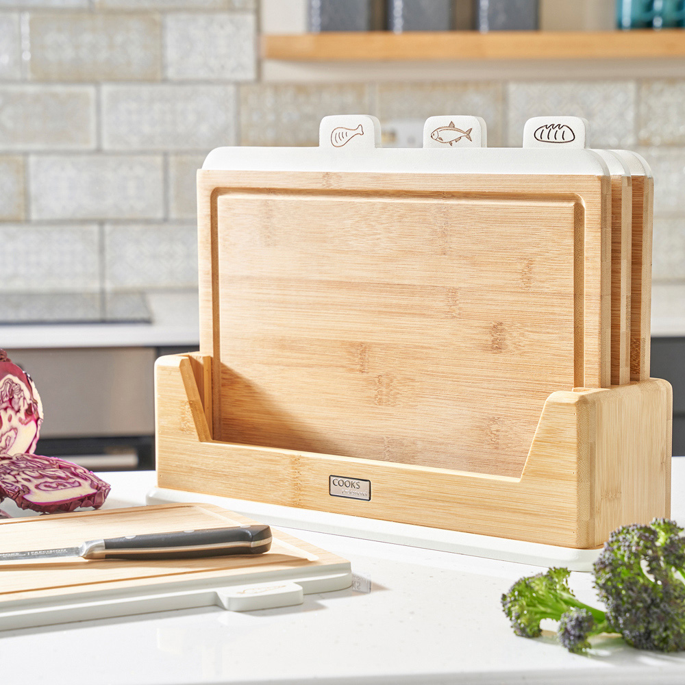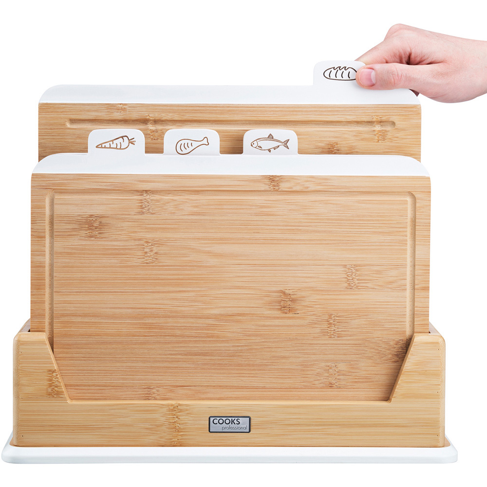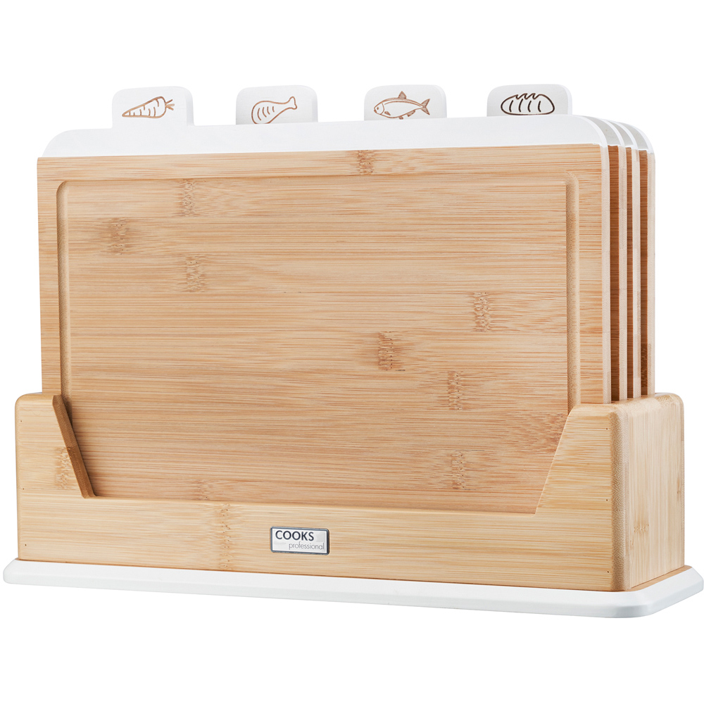 Simplify your food preparation with the Cooks Professional Bamboo White Tab Chopping Boards 4 Pack. This four-piece set features colour-coded and tabbed boards to prevent cross-contamination, making it easy to select the right board for fruit and vegetables, raw meat, cooked food, and fish. The stylish bamboo boards come with a slatted base to prevent dust build-up and a grooved breadboard for easier slicing. Neatly store the boards in their sturdy stand when not in use. Hand wash only. Includes a two-year warranty.