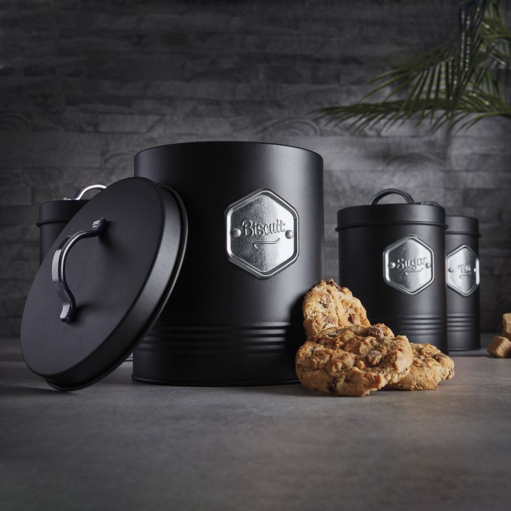 Keep your worktop organised with this five-piece black and silver kitchen storage set from Cooks Professional. The set includes three canisters for tea, coffee and sugar with airtight lids and a bread bin and biscuit tin. They are perfect to keep your food fresher for longer and your worktop neat. The tins are designed from powder-coated metal. Each tin has a label in raised writing, so you know what’s in what at a glance. Model no: K300.