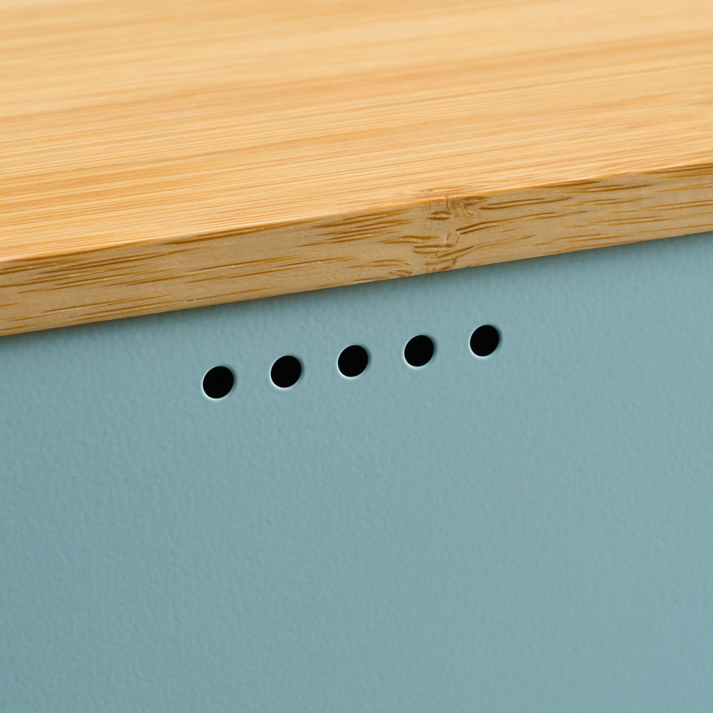 Transform kitchen storage with the Cooks Professional Blue and Silver Ribbed Bread Bin with Linen Bag and Bamboo Lid. Crafted from powder-coated steel, the oval ribbed body stands out with a classic badge and a modern bamboo lid that doubles as a handy cutting board. The matching linen bread bag helps keep bread, rolls, and pastries fresher for longer, making it easier to reduce food waste.