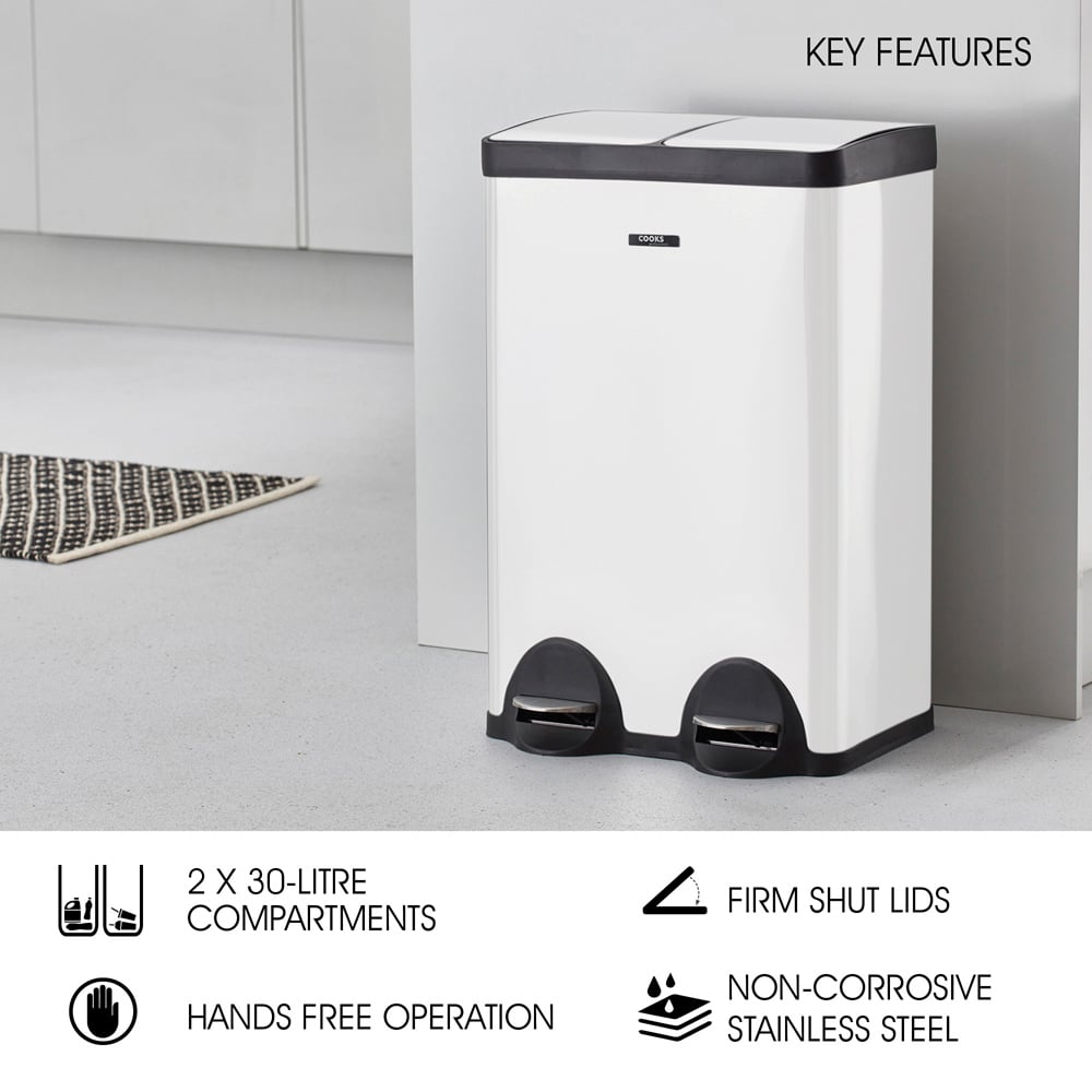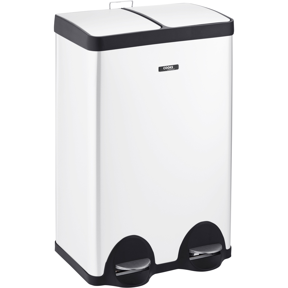 Recycle your kitchen waste in style with Cooks Professional Dual Compartment White Kitchen Rubbish Bin 60L with Recycling Pedal. This sleek dual recycle bin is a modern marvel crafted from thick 410 stainless steel. It also features a high-quality powder-coated paint finish. The bin has two compartments and is elegantly designed to keep your space tidy and sophisticated. It is equipped with firm-shut lids and two convenient foot pedals. It helps dispose of waste without touching it and keeps your hands germ-free. The bin keeps your kitchen, office or home pristine by reducing the risks of germs spreading with this hand-free functionality. The compartments boast a generous 30-litre capacity, adding up to 60L in total. It helps you segregate your general and food waste with the recyclables. The recycling bins are tough and withstand the test of time. This dual bin has a non-slip base that safeguards your floor and maintains stability. The separate compartments have separate lids for easy disposal. With a total 60L capacity, it holds more waste and reduces frequent outside trips to empty the bin. The firm-shut, soft-close lids keep the odours trapped in and prevent the spread of germs. The bin also features a dual pedal, one for each compartment. The handle at the back allows easy movement of the bin. It has a sleek, contemporary design and is made of non-corrosive stainless steel. The brushed effect ensures its durability and is long-lasting.