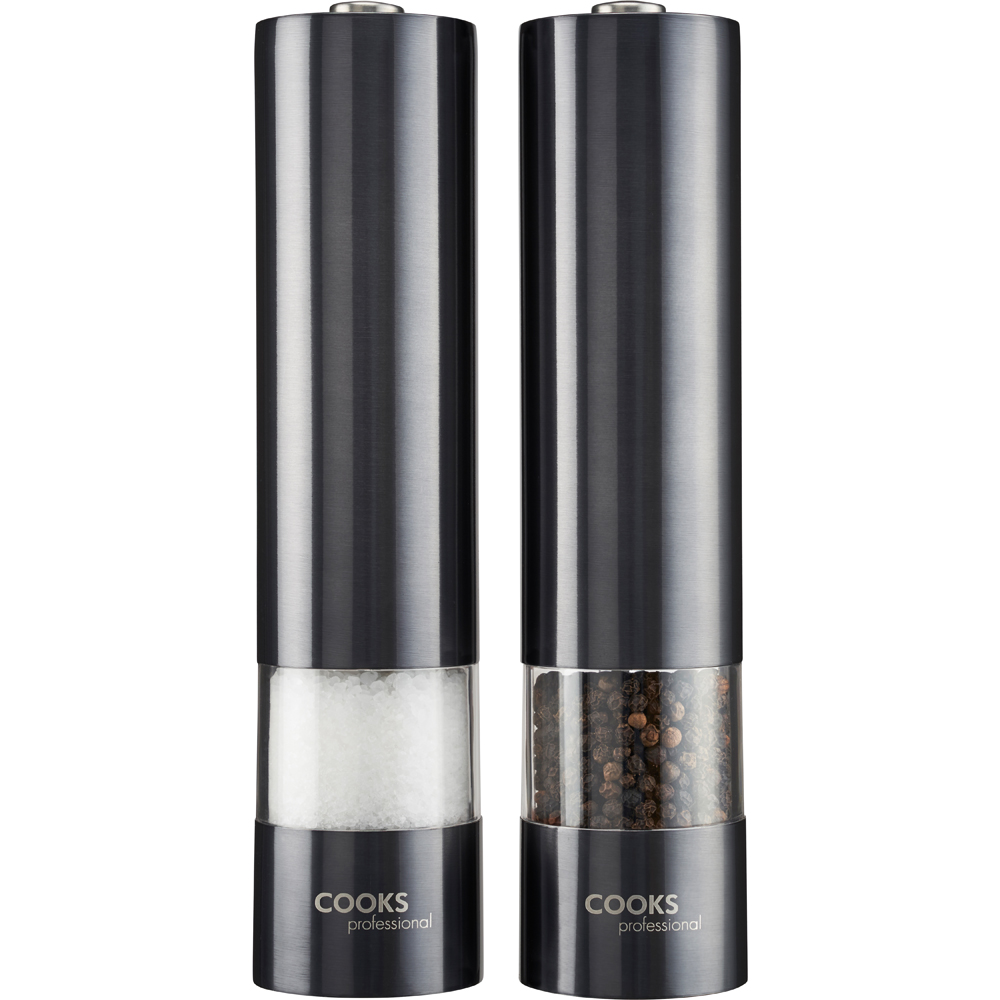 Enhance your kitchen counter with this Cooks Professional Electric Graphite Salt and Pepper Mill Grinder with Stand. This one-handed electric shaker set elevates your dishes to gourmet status. Powered by 4 x AA batteries (not included), This salt and pepper grinder set makes seasoning your food easier than ever. This product allows fine dusting to hearty sprinkle with adjustable grind settings. It offers a sensory delight of freshly ground sea salt and whole peppercorns. The grinder is activated with an innovative one-touch system, allowing a simple one-hand use. The product is crafted from high-grade stainless steel making it visually appealing and long-lasting. The electric salt and pepper mill set easily fits into your kitchen setup with dimensions of D5.2 x H22.3cm. They are easy to refill with the streamlined refill system. Twist the top lid counterclockwise to remove it, and then fill the base effortlessly. They come with a handy bamboo base for storage. This pair of salt and pepper mills from Cooks Professional adds a contemporary twist to your dining table.