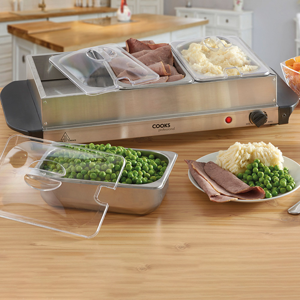 Keep your family and friends supplied with hot food with Cooks Professional 3-Section Silver Buffet Warming Tray. With a whopping 6L combined capacity, this all–in–one buffet warmer is a must for any home entertaining. This impressive buffet warmer comes with the ability to store up to three separate meals, from meats, vegetables, and curries, to soups and side dishes. Each separate section has a clear lid to lock in heat and moisture. An adjustable temperature dial allows you to select the perfect heat level for your meal. It also includes two safe and sturdy handles for simple transportation and tabletop serving. Model no: G0013.