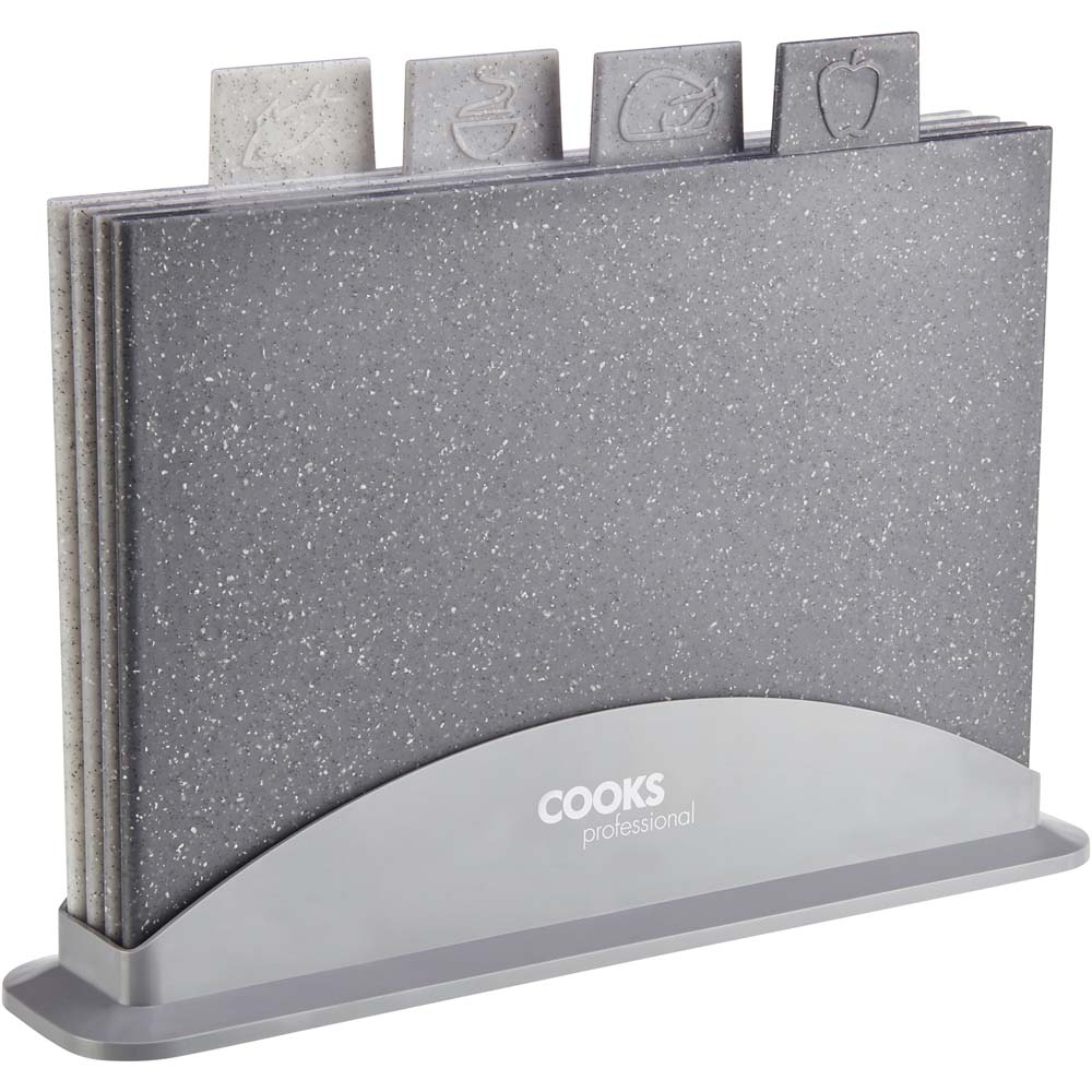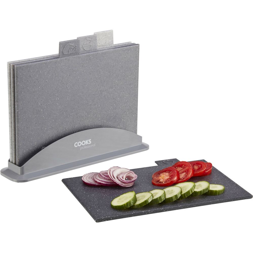 Make food preparation even easier with this four-piece chopping board set from Cooks Professional. This set of four fabulous, index-style granite-effect chopping boards will aid you in the preparation of food and ensure food is prepared safely by reducing the risk of cross-contamination. The illustrated tabs are in a staggered order, making it easy to identify the correct board for the food type you are preparing. The set includes chopping boards for fruit and vegetables, raw meat, cooked food, and fish. The boards are dishwasher safe. Each measures approximately 29 x 29cm. Unlike wooden chopping boards, they are non-porous, meaning that bacteria from the food you prepare cannot permeate the board and potentially contaminate it for future use. When not in use, the chopping boards can be neatly stored away in their sturdy, slim base to protect them. The boards themselves can withstand temperatures of up to 130 degrees Celsius, so you can use them for resting hot pans straight from the oven. Dimensions: Stand - L33 x W8 x H8cm and Boards - L29 x W0.5 x H20cm. Total weight: 1.65kg. Material: Polypropylene.