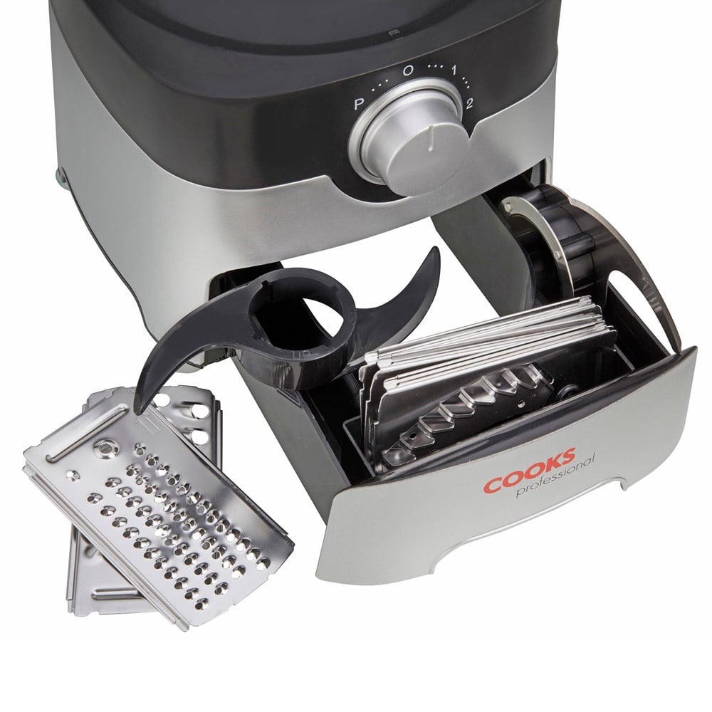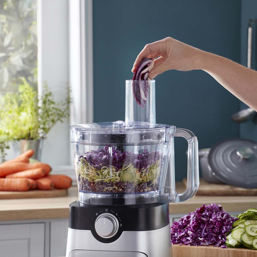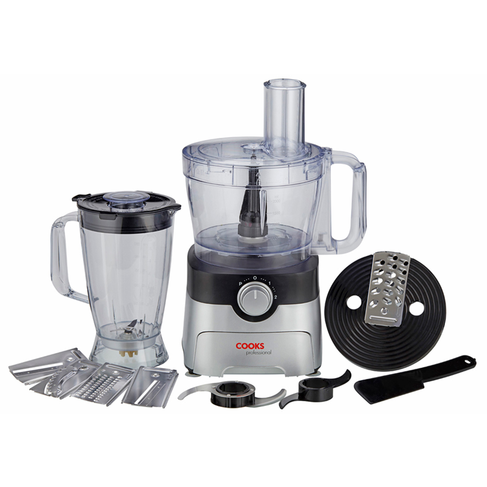 Enjoy creating a vast range of delicious meals and recipes with this powerful G3485 Black and Silver 1000W Food Processor from Cooks Professional. You can chop, blend, mix, grate and much more. The processor gives you all the convenience of a blender with a range of accessories. The accessories allow you to grind coffee beans or nuts, peel potatoes, mix dough, grate cheese and vegetables, blend and much more. With a large 3.5L mixing bowl that has a 2L working capacity and a 1.8L blender jug attachment, it’s quick and easy to make large quantities of fresh smoothies and more for all the family to enjoy. The blender jug features an access hole so that you can easily add extra ingredients or season to your mixture. The blender is perfect for making your favourite smoothies or soups at the turn of a dial. And to make life easier, there is even an included plastic spatula, great for getting your mixtures out of the bowl or blender with ease. This is an excellent addition to any kitchen and is great for preparing meats, vegetables, dough mixes, cake mixtures, jam, milkshakes and soups. Versatile yet compact, this food processor is great for those looking for a product that has all essential features without taking up all your precious worktop space. To achieve great results consistently, simply select your chosen attachment, place your ingredients into one of the bowls, pick a speed using the control knob and turn it on. No need to worry if the jug isn’t fitted properly, as there is a built-in safety function that will not allow the blender to work unless the jug is fitted correctly. Alternatively, you can add a grating, slicing or cutting blade to the blade adaptor disk and push the food through (using the food pusher) so it seamlessly chops, grates or slices your chosen food. Included attachments: 2L mixing and chopping bowl with food pusher, 1.8L blending jug with access hole, 1x metal chopping blade, 1x plastic dough blade, 1x French fry cutting blade, 1x thick slice blade, 1x thin slice blade, 1x fine grating blade, 1x coarse grating blade and 1x plastic spatula. Dimensions: L28 x W22.5 x H43cm (With bowl). Weight: 4kg. Power cord length: 72cm. 220-240W 50Hz.