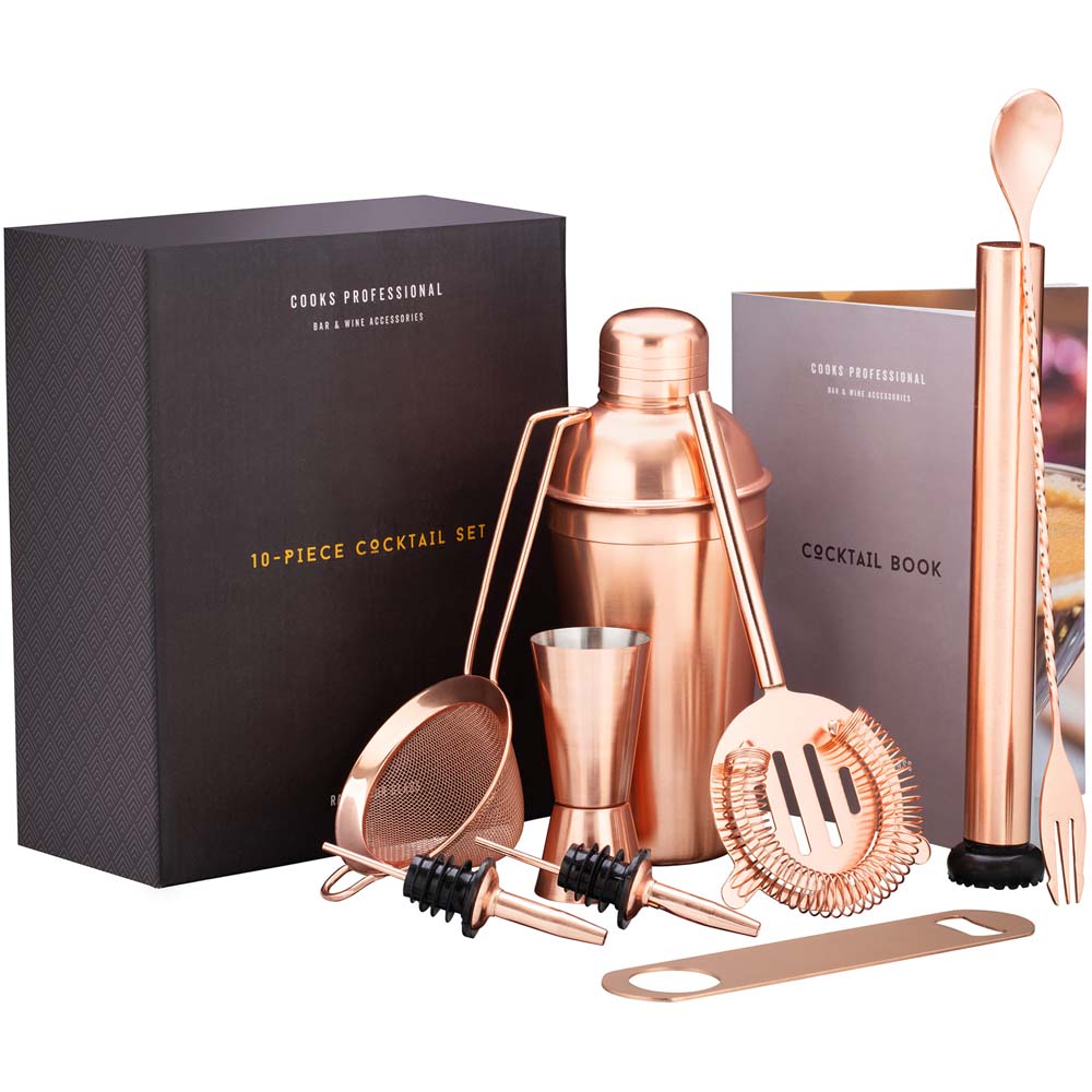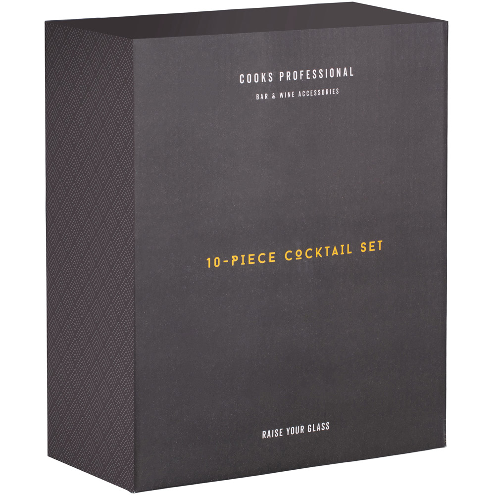 Treat yourself or your guests to some delicious homemade cocktails with this G4355 10-Piece Cocktail Set from Cooks Professional. Housed in a stylish gift box, the set contains a 500ml shaker, a 30/60ml jigger, two pouring spouts, a twisted spoon/fork, a bar strainer, a bottle opener, a wire strainer, a muddler and a recipe book - offering everything you need in one set. The stainless-steel design with thermal properties also makes the set resistant to chipping, and should you have a clumsy guest trying their hand at cocktail making, you can breathe easy knowing it won’t smash if dropped. The stylish cocktail-making set is designed in a contemporary metallic design, perfect for all homes. The included recipe book has all the classics, such as cosmopolitans, mojitos, espresso martini and even recipes for mocktails, so you don’t always have to include alcohol.