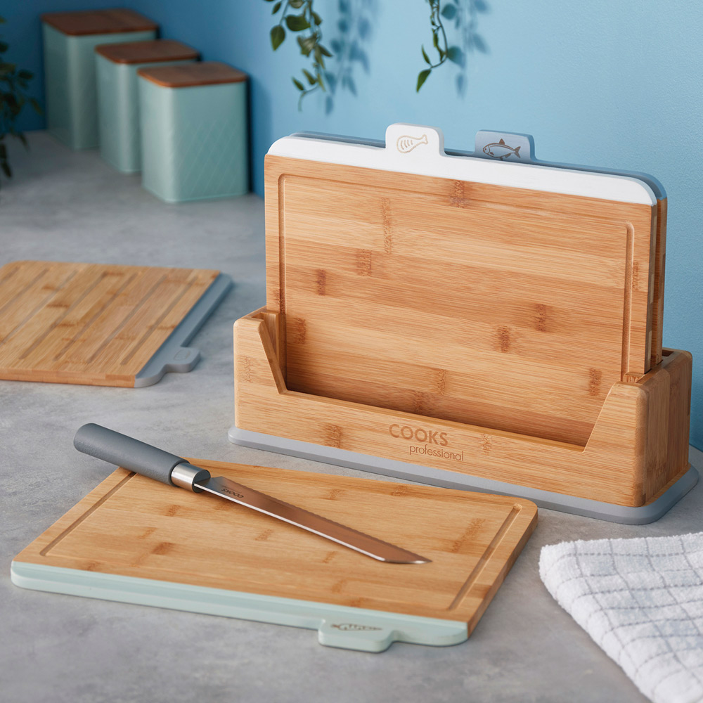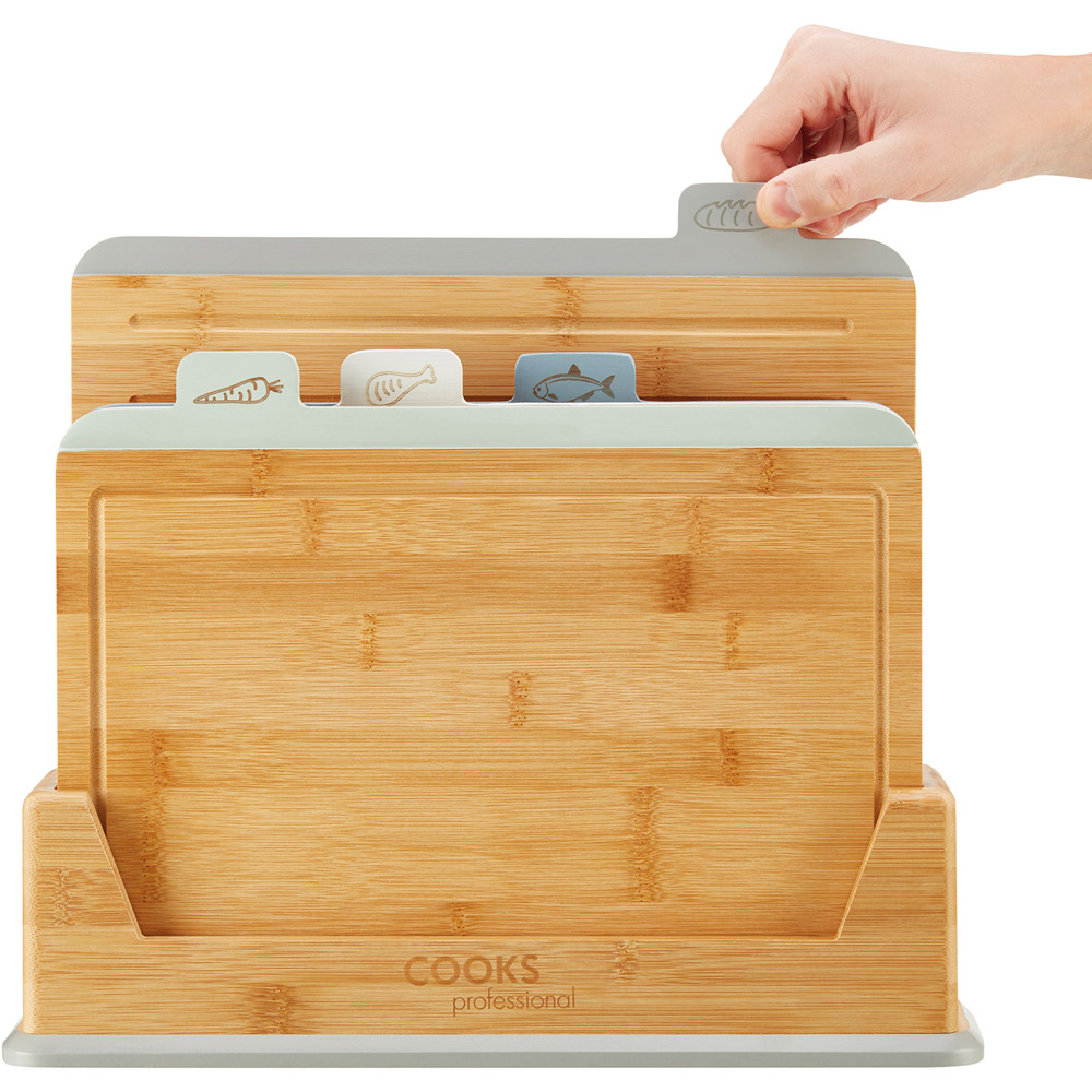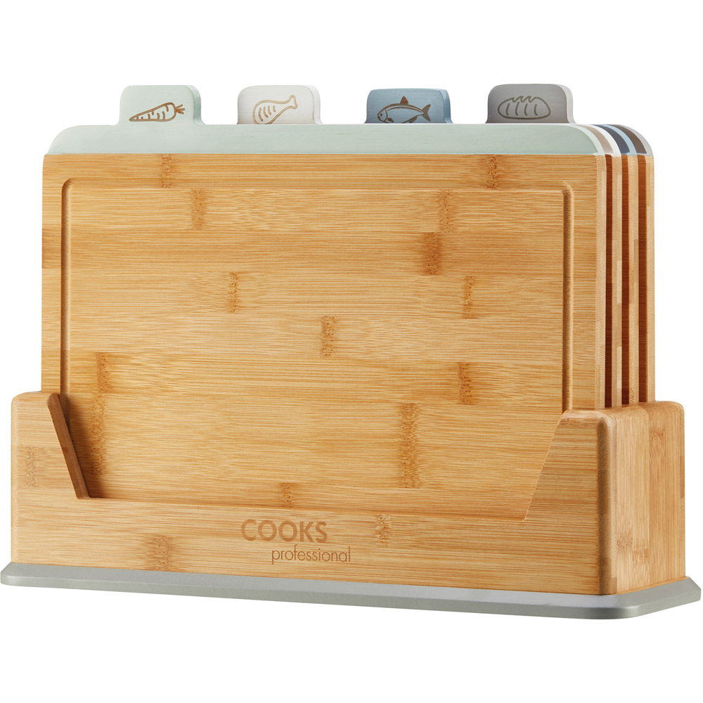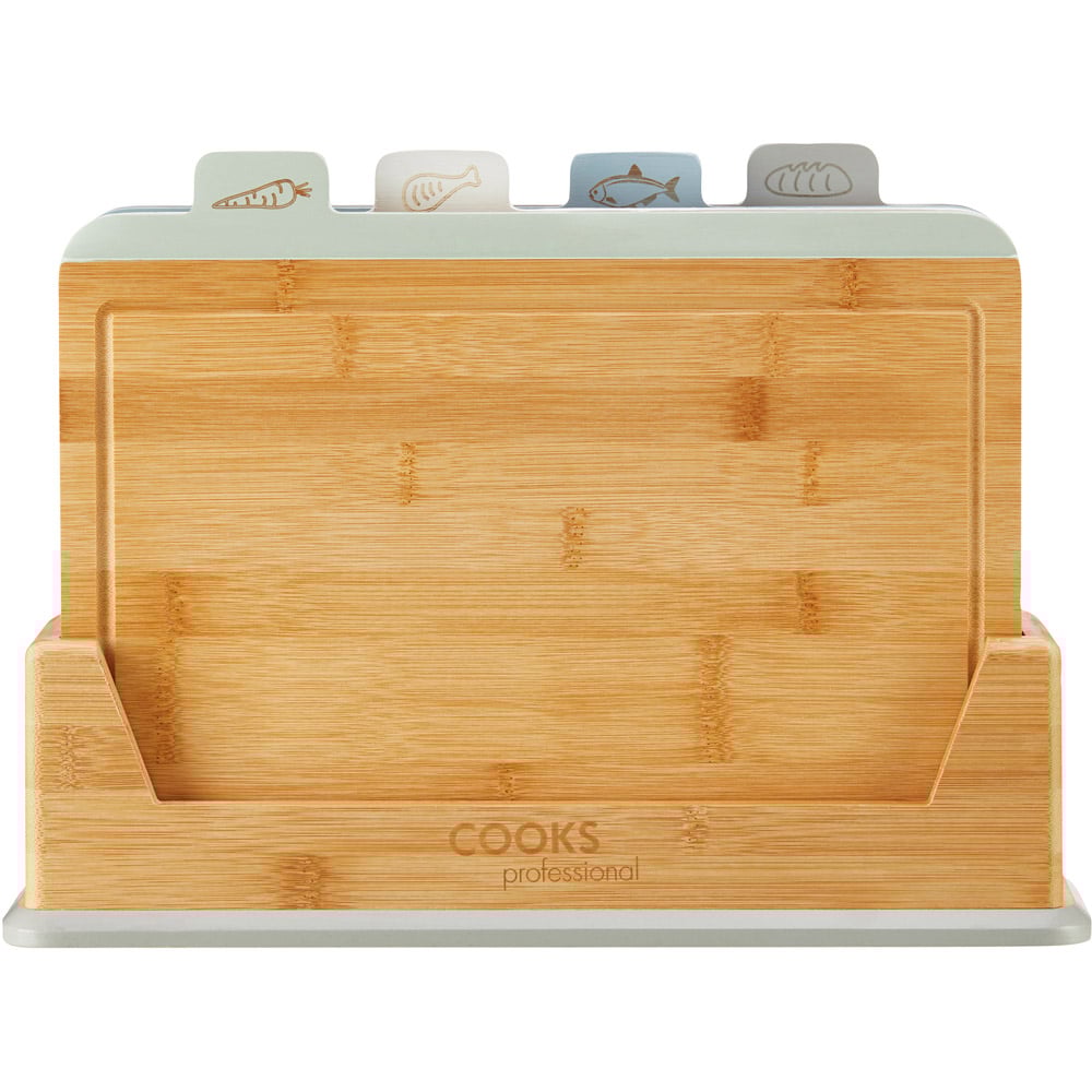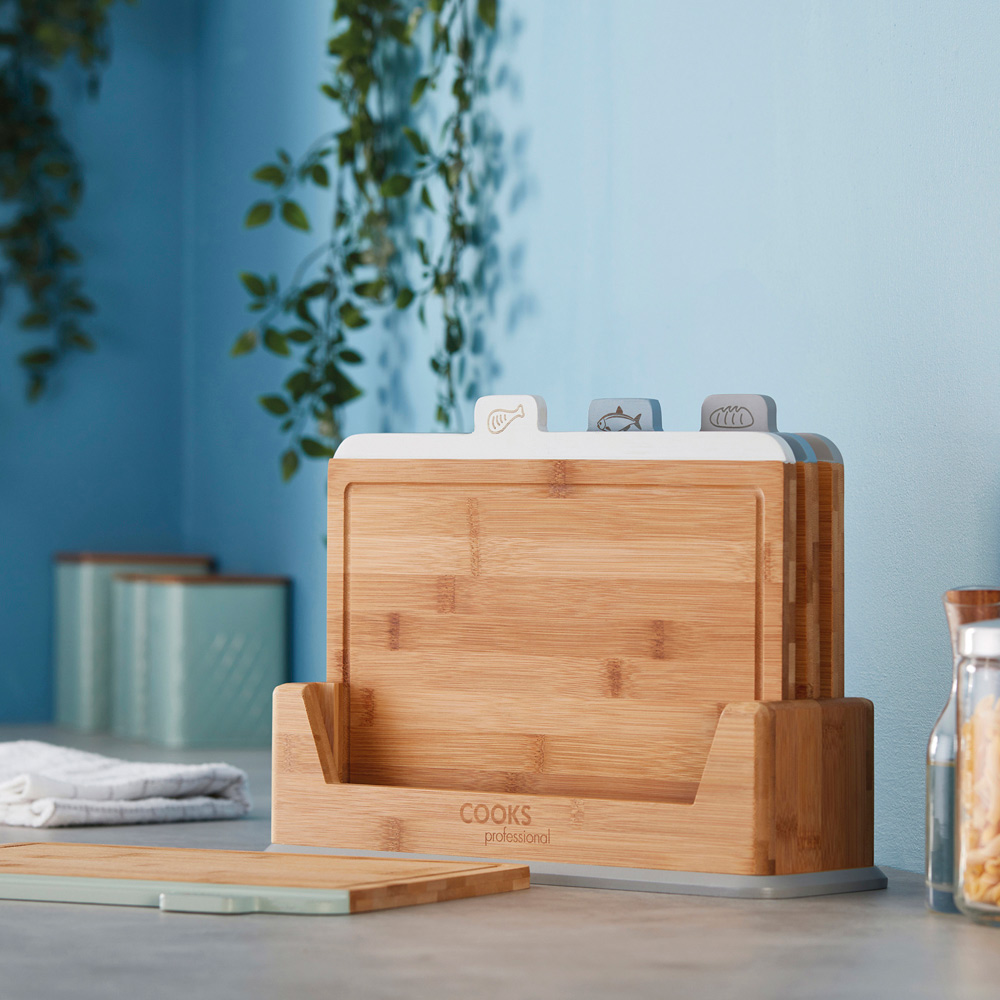 Make a practical addition to your kitchen with this Cooks Professional Four Piece Bamboo Index Chopping Board. This set of fabulous, index-style chopping boards will aid you in the preparation of food. It ensures food is prepared safely by reducing the risk of cross-contamination. The illustrated and coloured tabs are in a staggered order, making it easy to identify the correct board for the food type you are preparing. The set includes chopping boards for fruit and vegetables, raw meat, cooked food, and fish. The breadboard also features grooves, making it even easier to slice your favourite loaf. Specifications: Base size: H26.5 x W12 x L36.5cm. Board size: H25 x W1.2 x L32cm. Weight: 3.1kg. Model no: G4537.