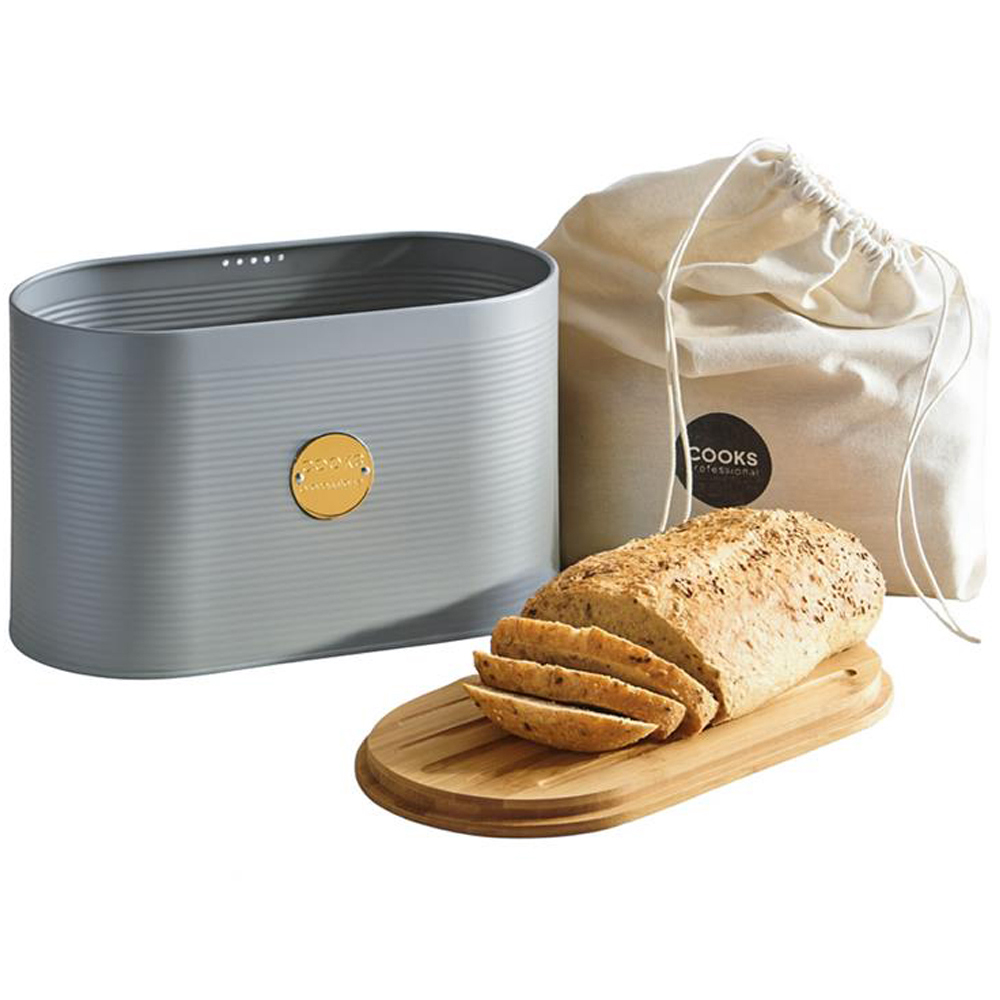 Transform kitchen storage with the Cooks Professional Grey and Gold Ribbed Bread Bin with Linen Bag and Bamboo Lid. Crafted from powder-coated steel, the oval ribbed body stands out with a classic badge and a modern bamboo lid that doubles as a handy cutting board. The matching linen bread bag helps keep bread, rolls, and pastries fresher for longer, making it easier to reduce food waste.