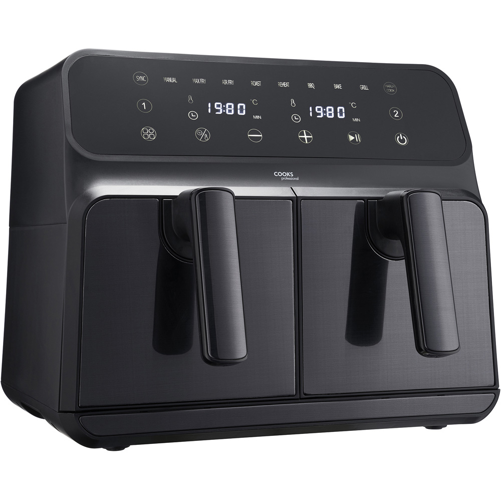 Upgrade your cooking game with the Cooks Professionals Black Dual Air Fryer. This 2 x 4L is a sleek and energy-efficient appliance that allows you to cook two dishes simultaneously. Its black stainless steel finish and digital panel make it a sleek addition to your kitchen. With 75% faster cooking times than conventional ovens, it's perfect for cooking multiple dishes simultaneously. The Sync Cook function sets different cooking programs to finish simultaneously, making it easier to cook multiple dishes at once. The Match Cook function allows you to cook using the same settings in both drawers and double your portions without extra effort. The air fryer measures 36cm x 33cm x 34cm and weighs just 7.5 kg, making it the perfect size for any kitchen. It has eight pre-set cooking times and temperatures, including Manual, Max Fry, Air Fry, Reheat, BBQ, Bake, Grill, and Sync Cook. Upgrade your cooking game with the Dual Basket Air Fryer 8L and experience ultimate convenience and efficiency in the kitchen. Model No. K216.