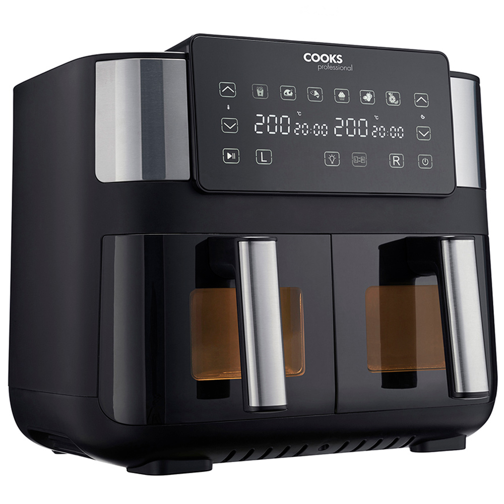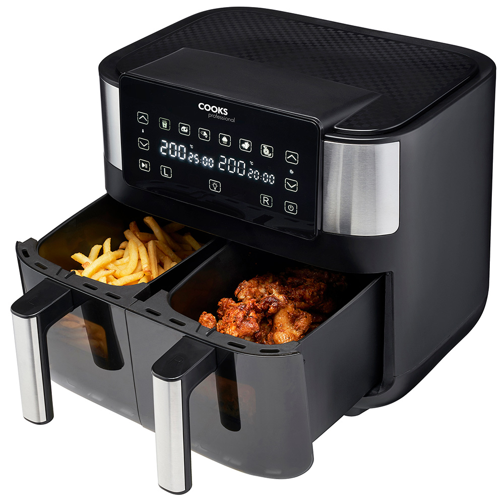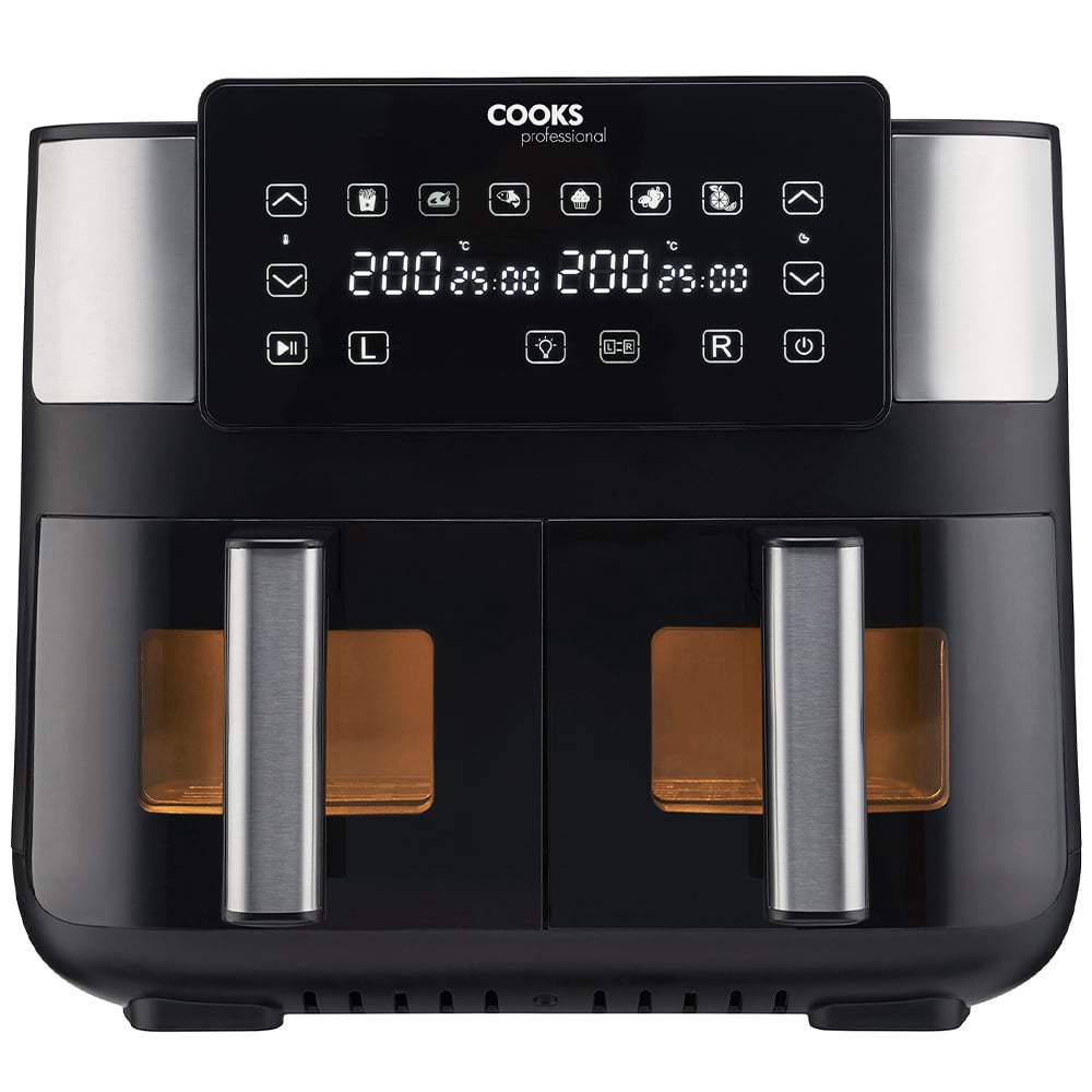 Introducing the innovative Cooks Professional 1700W Dual Air Fryer, the ultimate kitchen companion for health-conscious families seeking convenience and versatility. With its two independent frying baskets, you can now cook multiple dishes simultaneously, saving you time and effort. With the eight functions and health air fryer technology, you can enjoy crispy and delicious meals using little to no oil, promoting a healthier lifestyle for you and your family. The generous 8L capacity ensures you can prepare ample portions to feed the entire family or cater to guests, making mealtime hassle-free and efficient. You can also synchronize the cooking times and temperatures of both frying baskets, enabling you to cook two different dishes simultaneously without any flavour transfer, perfect for busy households. With the internal light and viewing window, you can monitor your food's progress without opening the fryer, thanks to the internal light and viewing window, ensuring your meals are cooked to perfection every time.