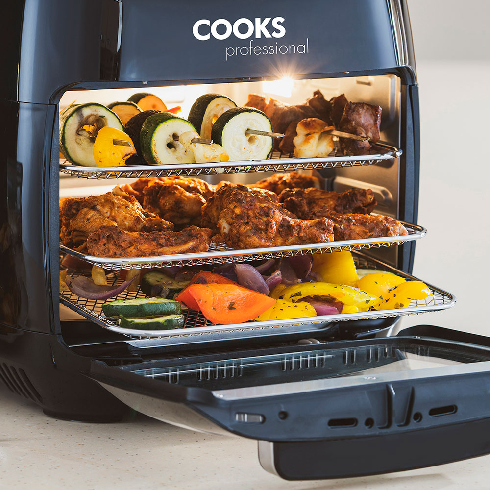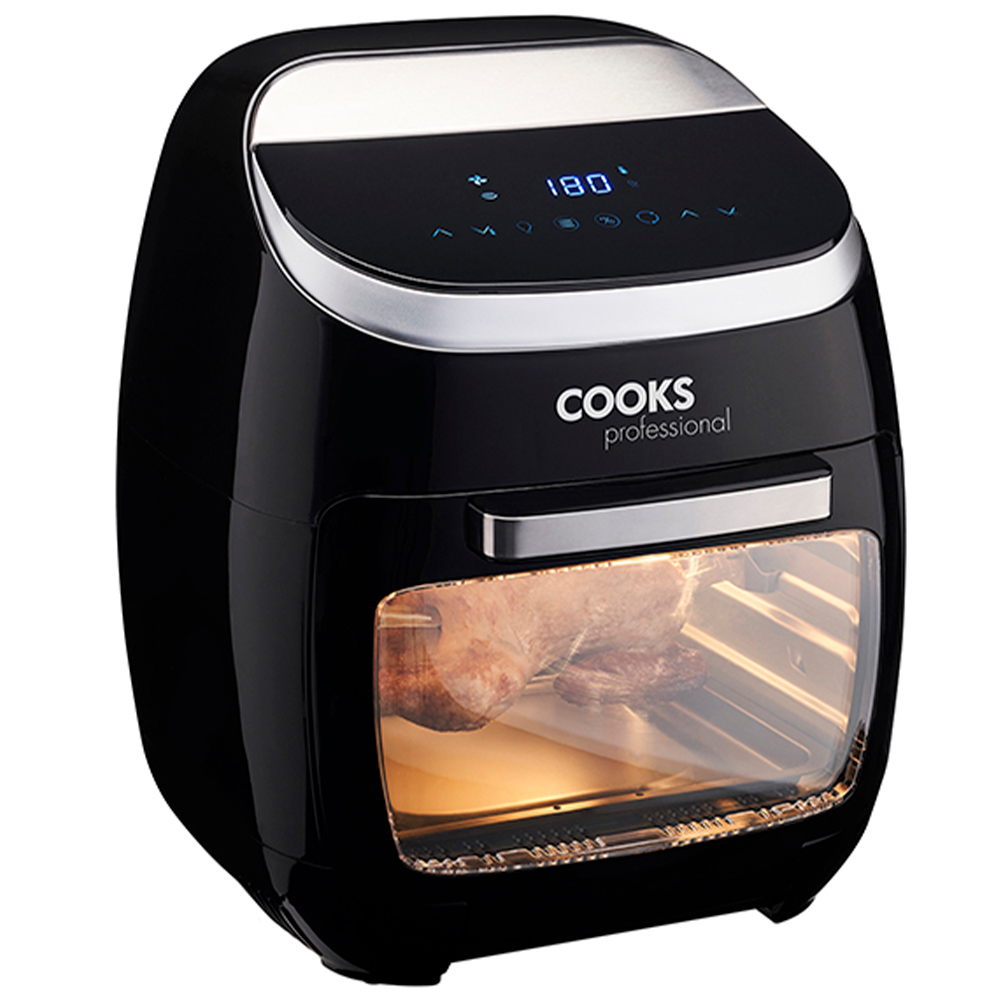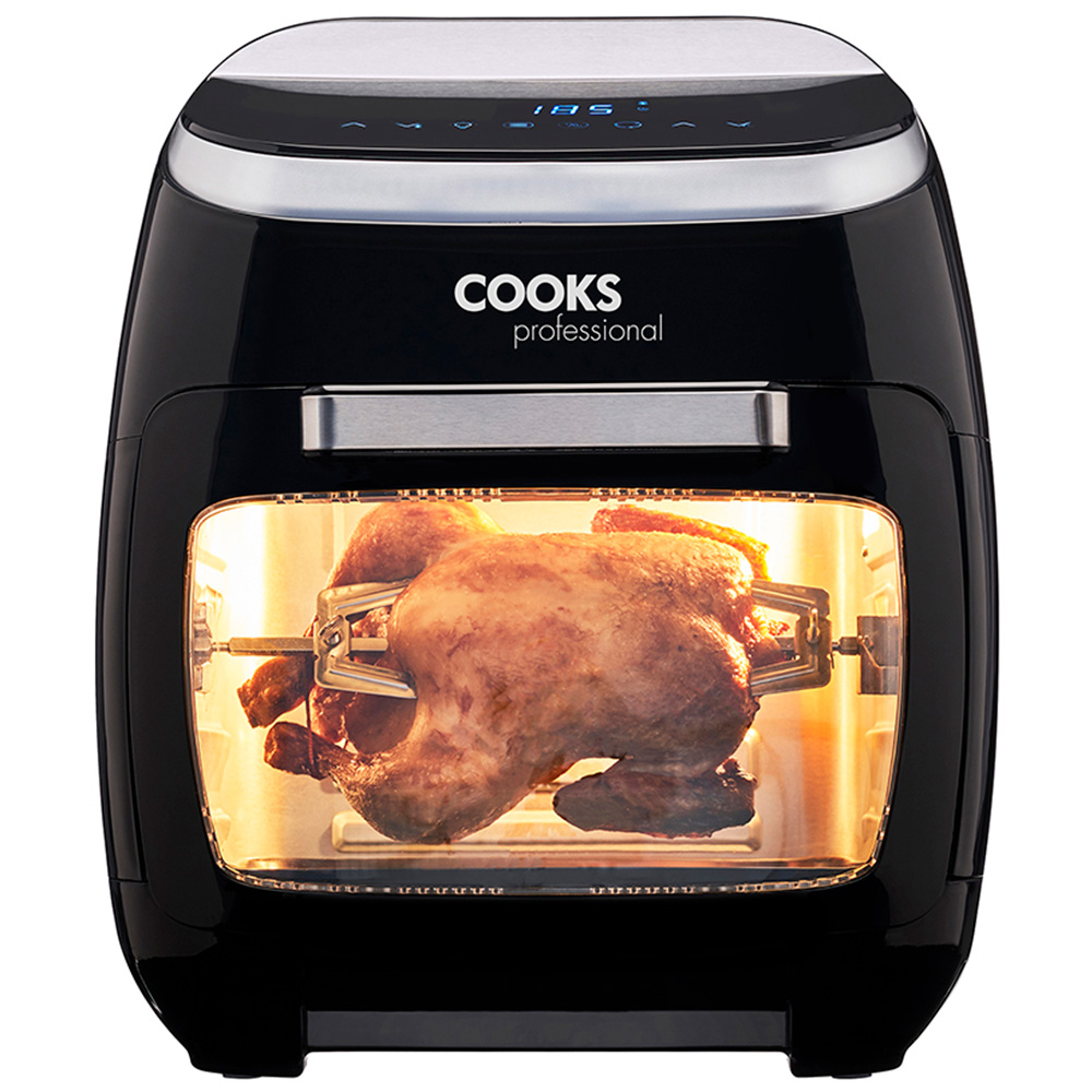 This Digital Air Fryer from Cooks Professional offers a range of cooking possibilities with its eight pre-sets and rotisserie rotating baskets, kebab skewers, and racks. With an impressive 11L capacity and powerful 2000W motor, it's designed to handle your cooking needs with ease. Its rapid air circulation technology, which requires minimal oil, reduces fat content. It's an energy-efficient appliance that saves you money on energy bills. The built-in drip tray collects excess oil and grease, making clean-up a breeze. Say goodbye to messy countertops and spend more time enjoying your delicious meals. The internal lamp illuminates the cooking process, while the large clear window allows you to monitor your food without opening the fryer. Stylish and practical, the fryer features a sleek black finish that complements any kitchen decor. It saves you money on energy bills while still delivering excellent cooking results. The pack includes a rotating frying basket, kebab skewers with a rotating holder, three air flow racks, a baking tray and a handle.