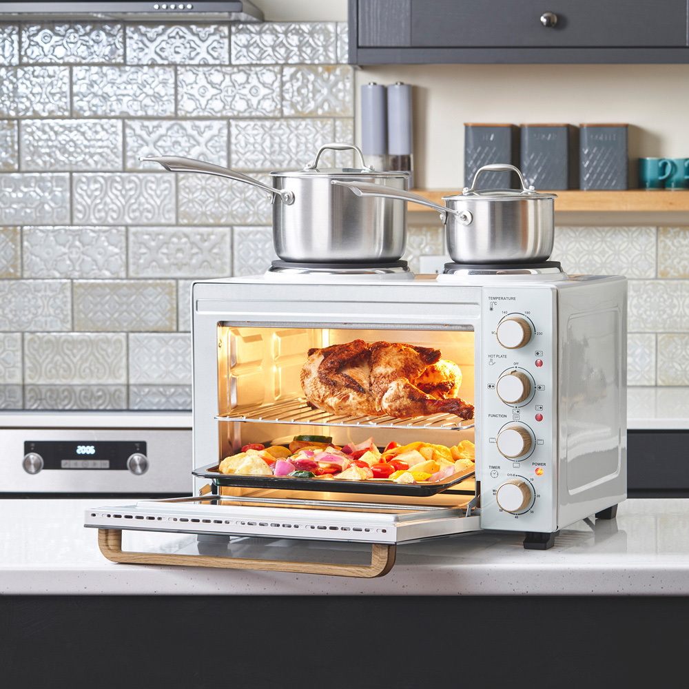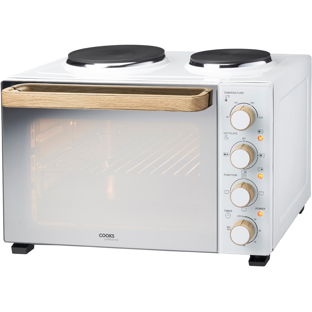 Upgrade your cooking experience with Cooks Professional K405 Counter Top 34L Mini Oven with Hobs. With its built-in timer, you can grill, roast, bake, fry, and boil while ensuring perfect timing for your creations. Tailor-made temperature control allows precise results from 100°C to 230°C, while the fan-assisted countertop oven evenly distributes heat, reducing cooking time without compromising flavour or quality. Simultaneously use the large and small hobs with the oven, expanding your cooking options. The included wire rack baking tray optimizes baking possibilities, making it perfect for small kitchens. Cooking excellence meets environmental consciousness, as these mini kitchen electric ovens save on electricity consumption. Unlock endless culinary possibilities with this compact yet powerful addition to your kitchen.
