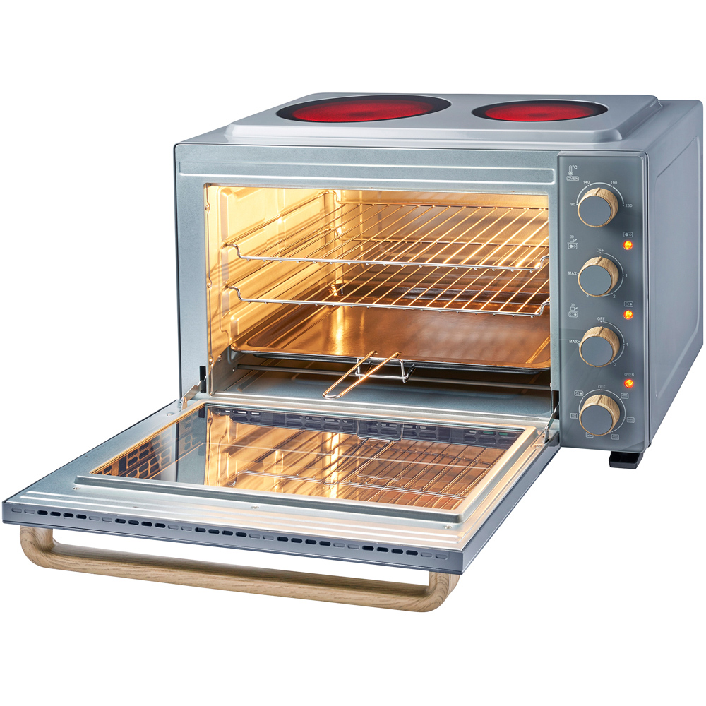 Elevate your cooking with the Cooks Professional K411 Nordic Grey 48L Electric Mini Oven with Ceramic Hobs, a compact and versatile appliance that combines a spacious 48-litre oven with two ceramic hobs. This mini oven allows you to cook a variety of dishes simultaneously, whether using the large hob with the oven or operating both hobs independently. With an adjustable thermostat ranging from 60 degrees to 230 degrees C, a fan-assisted oven for even heat distribution, and energy-efficient performance, it ensures precise temperature control and reduced cooking times. The sleek Nordic grey metal finish and compact size fit seamlessly into any kitchen decor, while the included baking tray, wire rack, and handle enhance versatility. Safety features include a power indication light, and the design helps reduce your environmental footprint. Note that only the larger hob can be used with the oven, both hobs can be operated simultaneously when the oven is off.