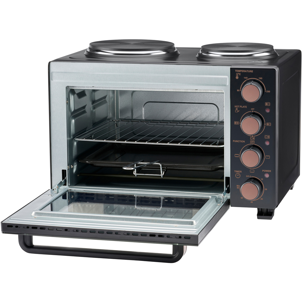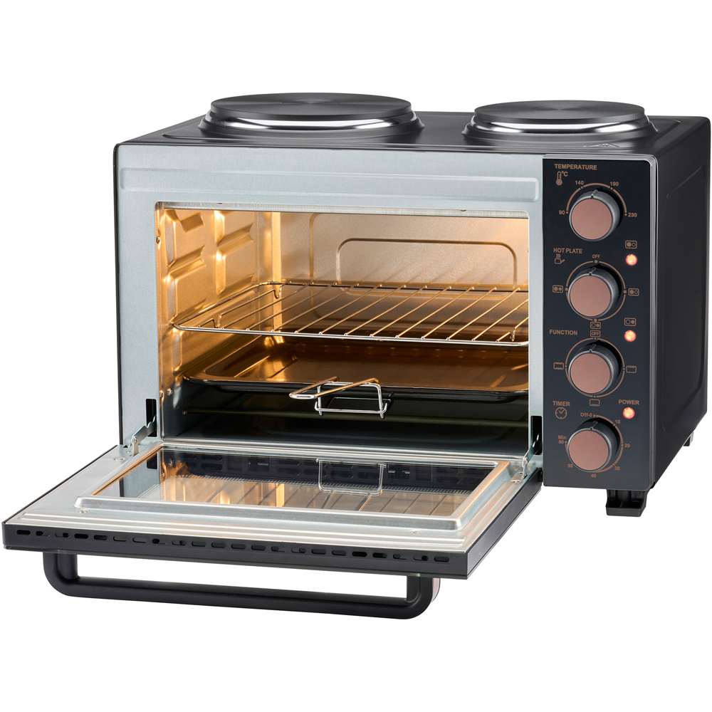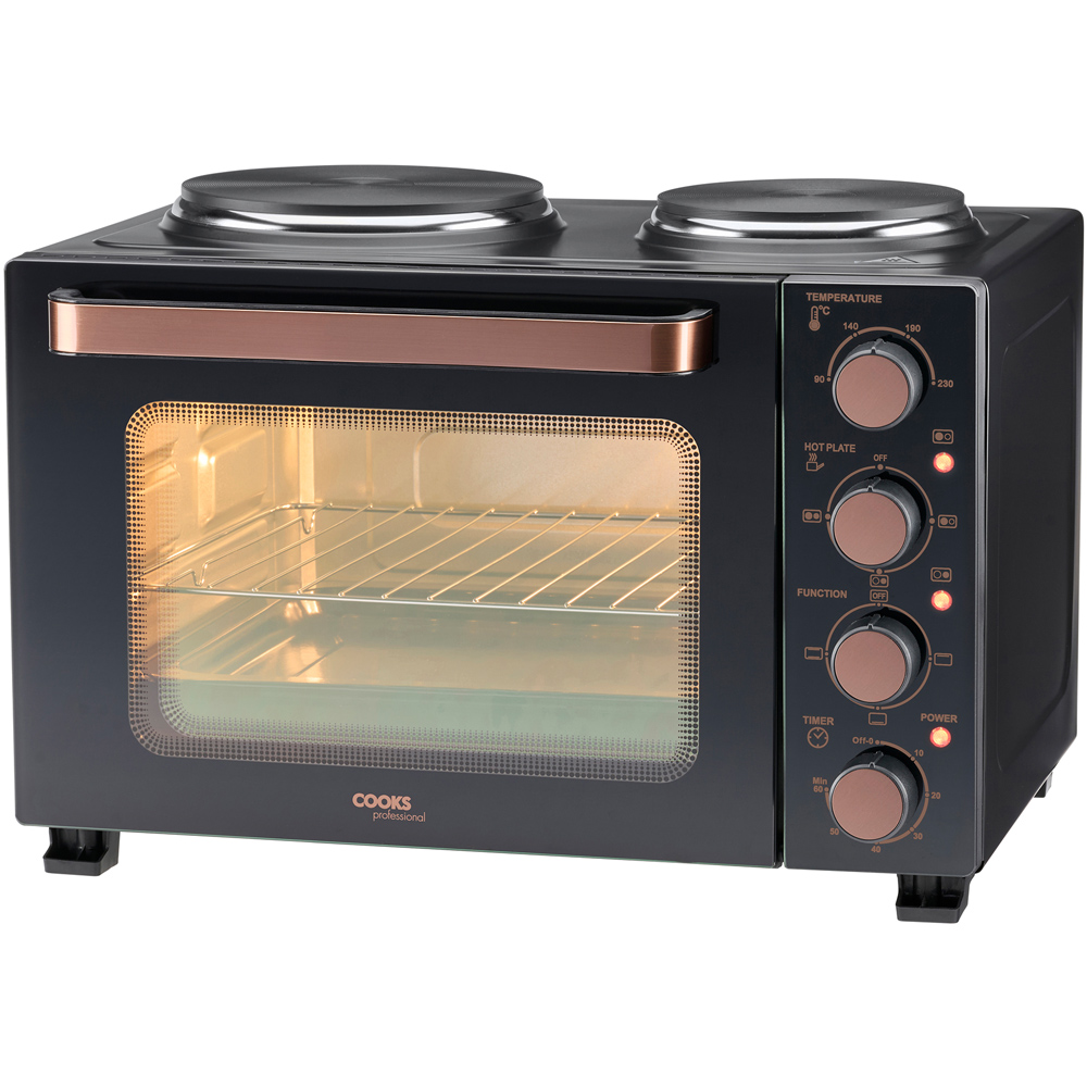 Upgrade your cooking experience with Cooks Professional K435 Black and Copper Counter Top 28L Mini Oven Grill with Hob. It is a versatile powerhouse for culinary creativity. With its built-in timer, you can grill, roast, bake, fry, and boil while ensuring perfect timing for your creations. Tailor-made temperature control allows precise results from 60°C to 230°C, while the fan-assisted oven evenly distributes heat, reducing cooking time without compromising flavour or quality. Simultaneously use the large and small hobs with the oven, expanding your cooking options. The included wire rack optimizes baking possibilities. Efficient and environmentally conscious, this mini oven helps you save on electricity consumption while delivering exceptional cooking results. Its discreet black metal finish seamlessly integrates into your kitchen decor. It comes with a 2-year extended warranty.
