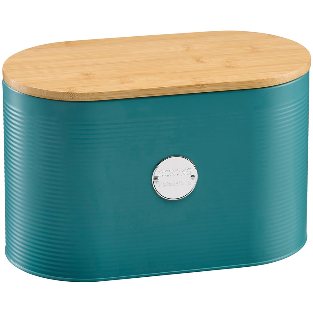 Cooks Professional Teal and Silver Ribbed Bread Bin with Linen Bag and Bamboo Lid