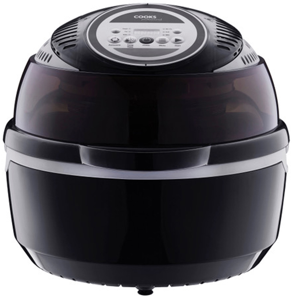 Enjoy efficient, fast and healthy cooking with this Cooks Professionals G4397 Black Rotisserie Air Fryer. The 1300W multifunctional air fryer is a versatile kitchen essential to roast, fry, bake, stir fry, grill and barbeque, all in one compact and stylish unit. Features a double-cell construction that allows the outside to remain cold when in use and cooks food with very little or no oil. The 10-litre capacity air fryer ensures the food is cooked to perfection every time with its inbuilt control panel and even heating fan technology. There is also a pause function on the control panel to check on your meal, add ingredients or adjust the seasoning halfway through cooking, and all settings will be saved. With the keep warm function, adjust the temperature to 150°C until you are ready to serve, and the non-stick bowl is removable for easy cleaning. This brilliant air fryer includes everything you need to cook quickly and healthily. The accessories include: Spindle and rotisserie cage: For cooking small pieces of meat, chips, nuts and coffee; Tongs: To remove trays or food; Dual height rack: For roasting, grilling, steaming and baking; Chicken forks: Perfect for whole chicken; Steak and fish rack: For cooking your steak or fish just how you want it; Oil sprayer: To easily spray your food before and during cooking; Rotisserie stand: To safely support your rotisserie cage and fish/steak rack when they’re hot; Baking tray: Great for cooking bread. It has an in-built fryer basket to fry frozen chips, stir-fry vegetables and more. The grilling rack allows you to cook pizza, steak, and sausages or remove the accessories completely and cook a chilli con carne in the non-stick bowl provided. Dimensions: L35 x W43.6 x H33cm. Power Cord Length: 96.5cm. Temperature Range: 50-230°C. Time Setting Range: 1-60 minutes.