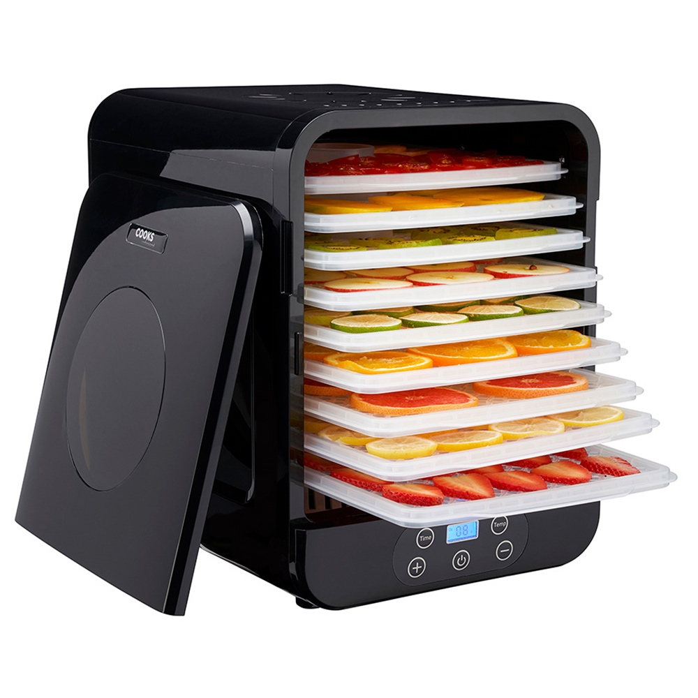 Go for the healthiest way of preserving your food with the Cooks Professionals 9-Tier Food Dehydrator. It features a nine-tier design to dehydrate varieties of food simultaneously, from fruit and vegetables to fish and beef. Effortlessly adjust temperature and time settings with the easy-to-use digital control panel, making it simple to achieve perfect dehydration results every time. The transparent door allows you to easily monitor the dehydration process, so you can rest assured that your food is drying perfectly. The powerful 500W motor dries fruits, vegetables, meats, and more quickly and efficiently. This food dehydrator is perfect for drying fruits, vegetables, meats, herbs, and more, providing a convenient and cost-effective way to preserve food and reduce waste. Equipped with a powerful yet energy-efficient motor, this dehydrator uses minimal electricity while delivering fast and efficient dehydration performance. The removable trays and drip tray make cleaning this dehydrator a breeze. Model no: K208.