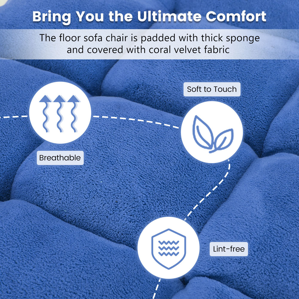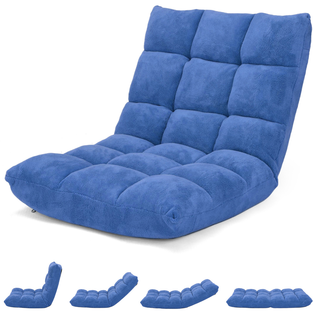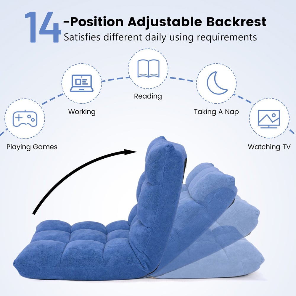 Settle in for victory with the next-level design of the Costway Navy Coral Velvet Floor Gaming Chair with Adjustable Back. This floor chair offers a 14-position adjustable backrest, allowing you to easily customise the angle from 0 to 84 degrees to suit your needs. The solid, flexible steel adjuster ensures smooth and effortless operation every time. Filled with ultra-thick, high-density sponge, this chair provides reliable and comfortable support. The soft coral velvet cover is skin-friendly and adds a warm touch for extra cosiness. Its sturdy frame is made of heavy-duty steel and supports up to 90kg. Plus, the base of the chair is protected with non-slip and wear-resistant 300D Oxford cloth for long-lasting use. This versatile chair fits any setting, making it perfect for meditation, reading, watching TV, and playing games. Best of all, it requires no assembly. Simply unpack and start using it. When not in use, the chair easily folds flat for convenient storage under a bed or sofa.