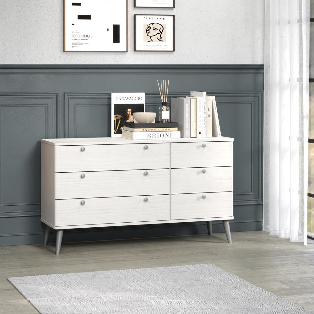 Enhance the ambience of your home with this Core Products Augusta Curve 3 Plus 3 Drawer Wide Chest of Drawers. It features three wide alongside three narrow drawers emphasised with soft rounded edges and a white wax finish that accentuates all the natural characteristics of the responsibly sourced pine wood it is made from. With softly rounded handles and mid-century tapered legs finished in a subtle matt silver, it creates a truly striking, clean look that would be a suitable addition to any bedroom. This double chest comes with six spacious drawers and is very practical for use as a dressing table as well as storing all your bedroom essentials.