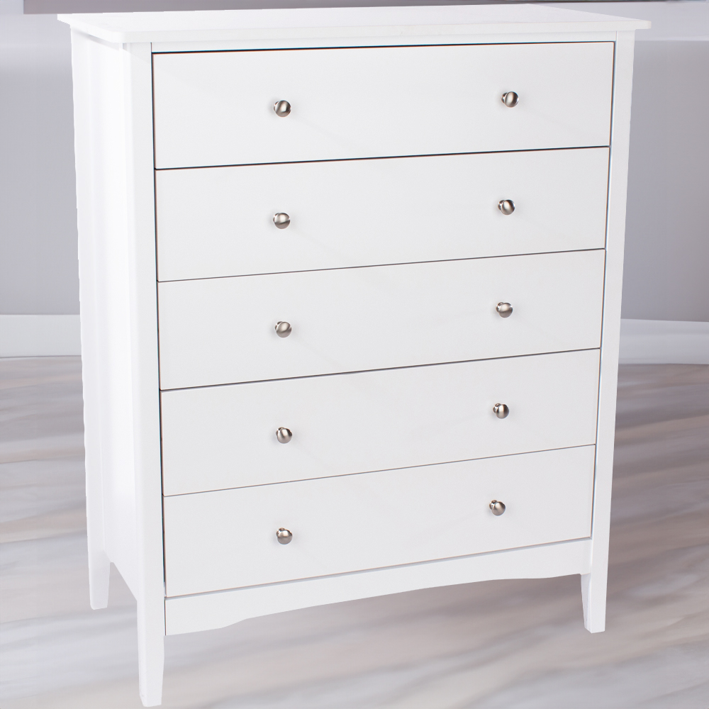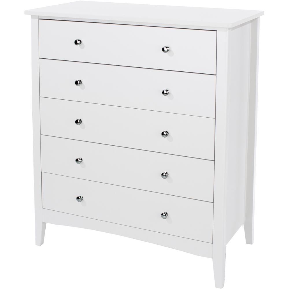 Elevate your space with style with the Core Products Como 5 Drawer White Chest of Drawers. This five-drawer chest features a hard-wearing white paint finish. The finish is complemented by tapered legs, real metal handles and easy-glide drawers. Moreover, the equal size drawers allow plenty of space for organising and storing all your clothing.