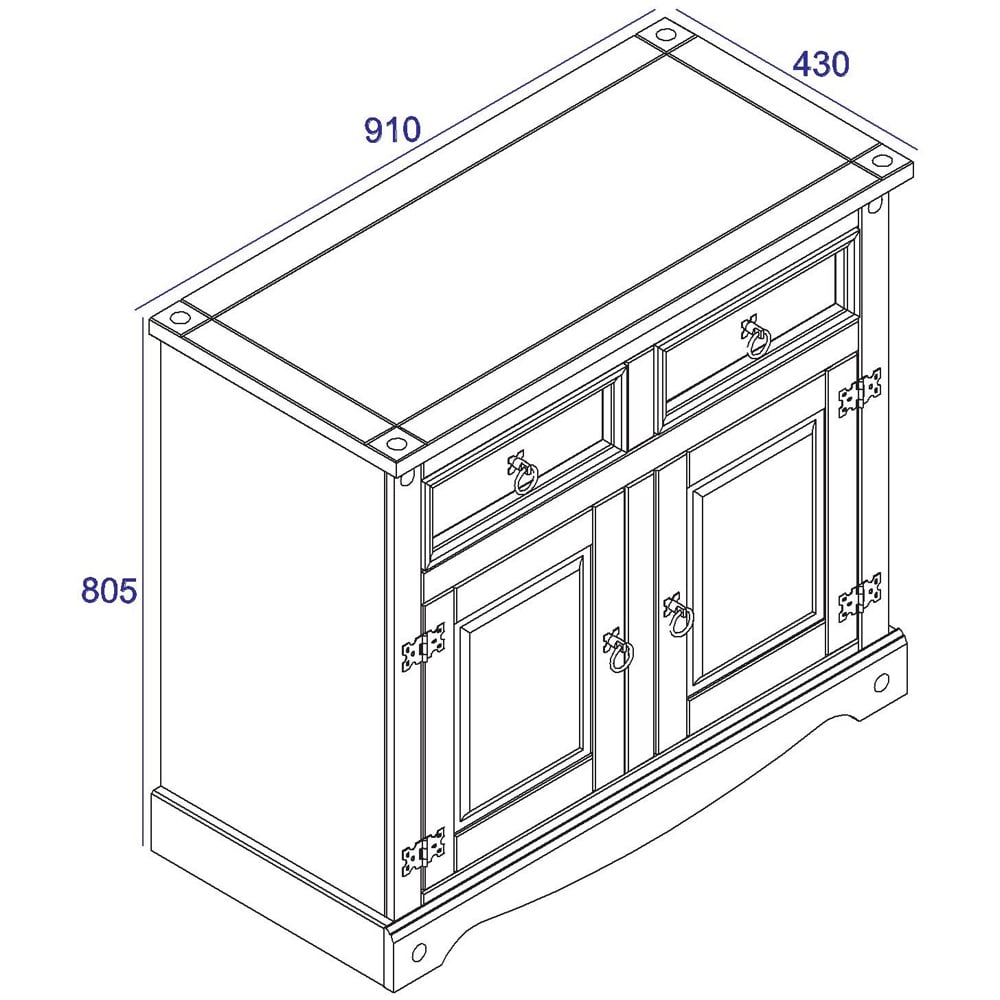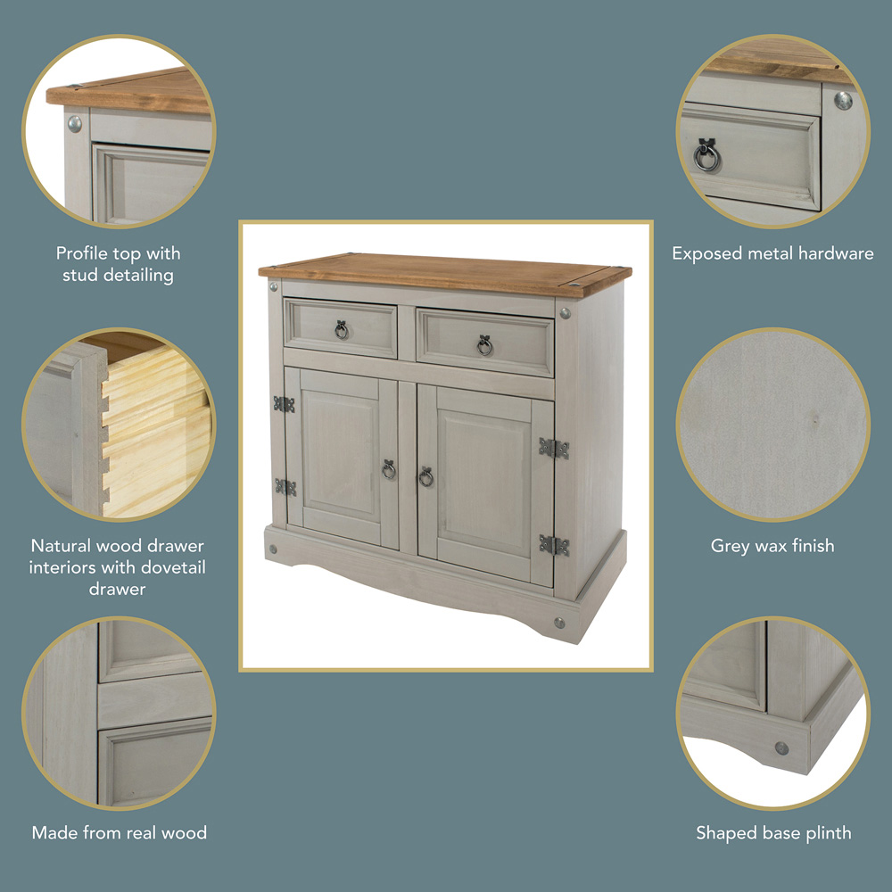 Declutter your space in style with the Core Products Corona 2-door 2-drawer Grey Small Sideboard. This sideboard will make a fabulous feature in any room. Despite being compact, it has two doors and two drawers with plenty of space to store plates, cutlery, bedsheets, clothes and more. Also, finished with a grey and antique wax and made from solid wood this unit is hard-wearing and easy to clean. Plus, the unit has black stud detail, ring pull handles and exposed hinges for added style and support. Easy to assemble, it's simple to put together and comes complete with all fitting and assembly instructions.
