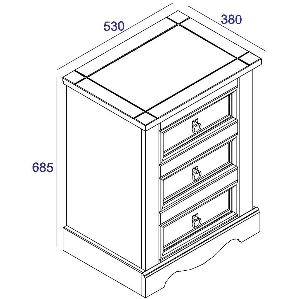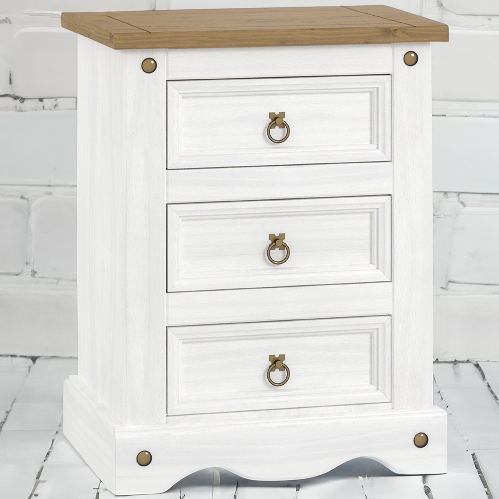 Make a stylish addition to your space with this Core Products Corona 3-drawer White Bedside Cabinet. Featuring three drawers, this unit offers a lot of space for your personal belongings, phone chargers, table lamps and more. Made using pine timber and boasting a white waxed body finish along with an antique top, this beside cabinet makes a stylish yet sturdy option. Also, it comes with antique brass colour studs, hinges and drop ring pull handles for added style. Plus, the door can be hinged either left or right as per your convenience. Easy to assemble, all the instructions are included with a detailed step-by-step guide and fittings.