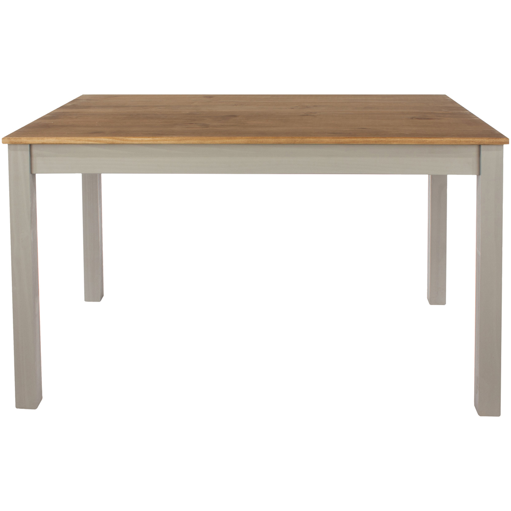 Dine in style on this Core Products Corona 120cm Rectangular Dining Table in Linea Grey. This is a beautiful yet simple dining table with a stylish two-tone design for that modern twist. Its smooth top comes with a two-plan design with a V grove down the middle of the top. Also, the top is finished with an antique wax coating and the legs and frame come in a contrasting grey wax which allows the natural characteristics of the timber to show through. Strong and sturdy, the legs are made from solid pine and steel bolted for extra stability. This dining table is suitable for four to six individuals.