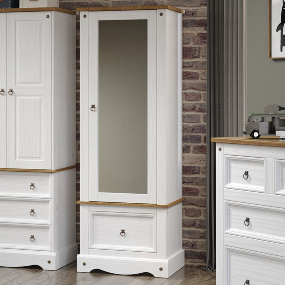 This Corona style armoire provides a practical combination of drawer storage, hanging space and a mirrored door make this an ideal wardrobe or storage cupboard for small rooms. Finished in elegant white and antique wax finish with a useful three quarter length mirror which will brighten any space. The useful drawer features real dovetailed joints and combined with the hanging space will take up to a generous 40kg of storage, there is also a select range of matching pieces in this range.