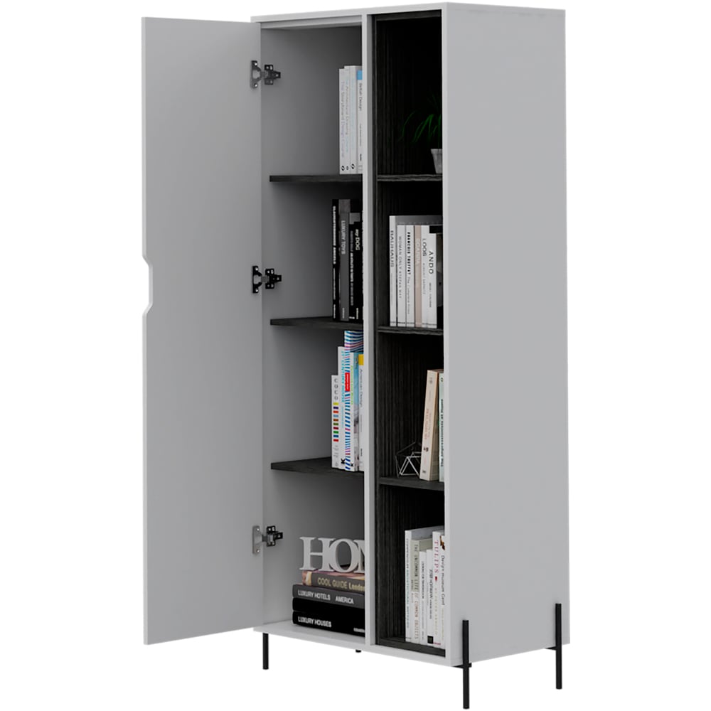 Add a touch of functionality and style to your home decor with the Core Products Dallas Single Door White and Carbon Grey Bookcase. This white and carbon grey oak effect cabinet has a subtle finish and it features a single-door design with enclosed shelves for keeping your books and display items. It also features three open shelves for keeping your essentials with sturdy metal pin legs that give it a timeless look. This cabinet goes well with both traditional and contemporary interior spaces.