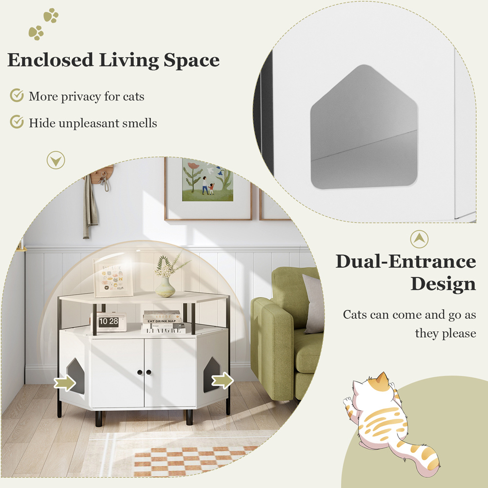 Craft a serene sanctuary for your feline friends with the Costway White Corner Cat Litter Box Enclosure with Open Shelf. It is ingeniously designed to fit snugly into any corner, optimising both space and home aesthetics. This nifty enclosure features a dual-door system for hassle-free cleaning and dual entrances to satisfy your cat's curiosity and ease of access. The enclosed design not only provides ample private space for your pets but also helps to contain odours. It doubles as a stylish storage solution with its sturdy top surface and additional shelf, perfect for holding cat essentials or decorative items. The robust construction supports up to 90 kg and includes adjustable foot pads to ensure stability on uneven floors, making it a safe and durable choice for any cat owner.