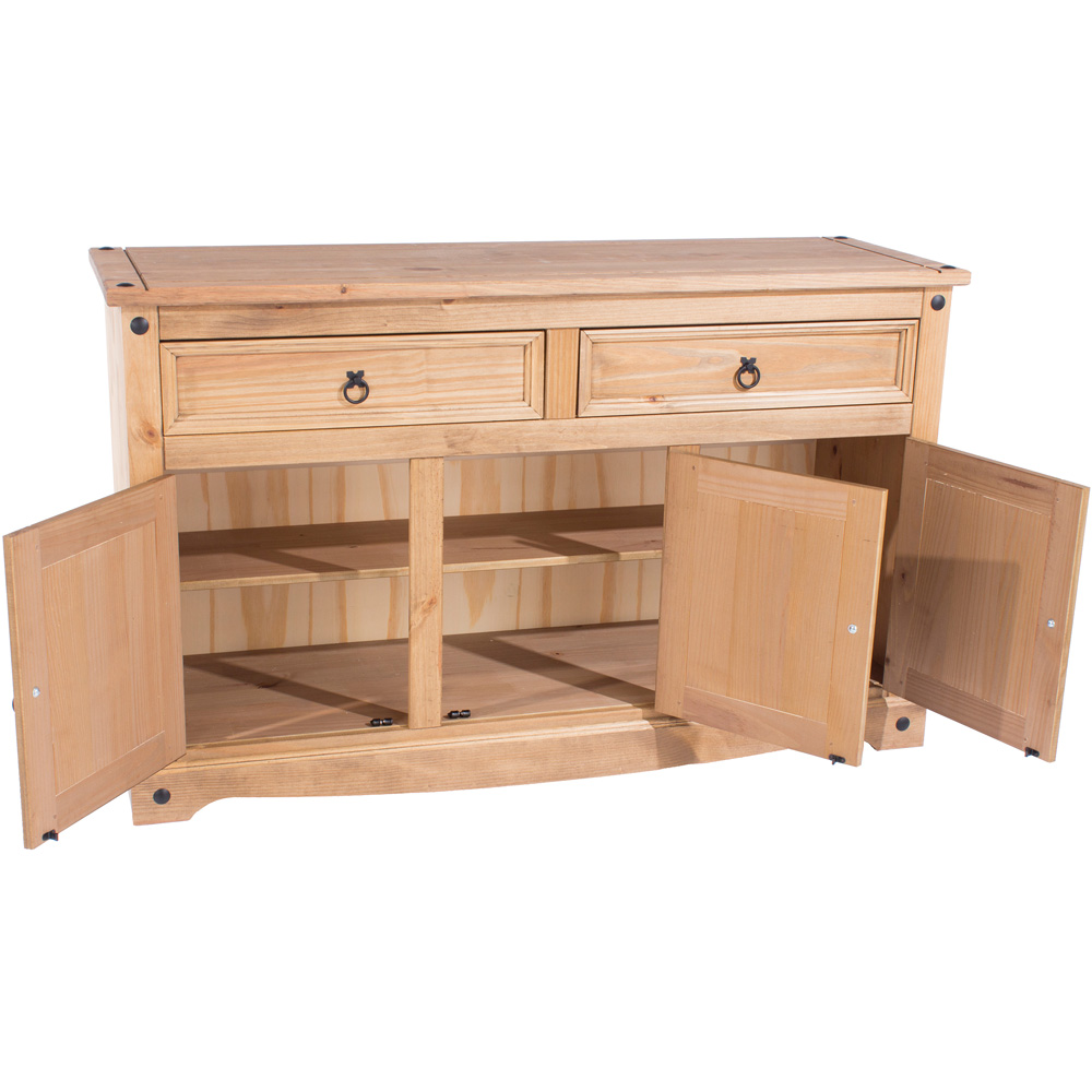 Unveil the art of tidiness with this Corona 3 Door and 2 Drawer Antique Wax Finish Medium Sideboard. Made from pine, the sideboard features two wide drawers with dovetails and three doors below, behind which you will find an adjustable shelf. This sideboard offers ample storage for all your needs and will look great in your living room, dining room or hallway. It is finished in a beautiful antique wax with black metal drop handles and hardware.