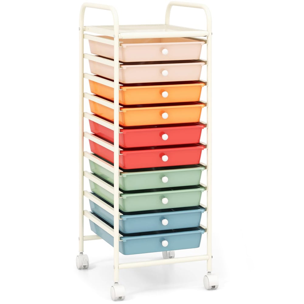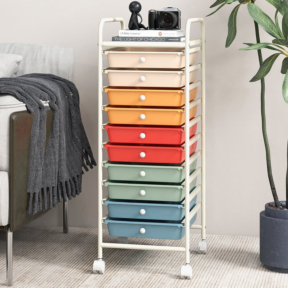 Make storage and space-saving easy with the Costway 10 Drawer Colourful Mobile Storage Trolley. This sturdy and lightweight cart is perfect for organising papers, tools, and accessories. Its 10 drawers make organisation a breeze, while the 360-degree swivel wheels provide mobility. The solid chrome-coated iron frame ensures durability, making it perfect for home, office, or garage use.