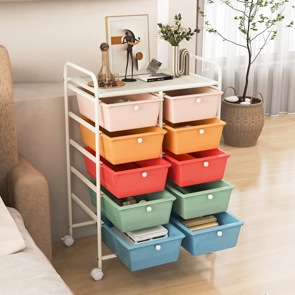 Whether you're a teacher looking for a way to store and organize classroom supplies, an office worker in need of extra storage for paperwork or a homeowner wanting to declutter your space, the 10-drawer rolling storage cart is a practical and stylish solution! This utility cart features 1 mesh top platform and 10 spacious drawers, allowing you to store and organize a variety of items such as tools, scrapbook paper, office supplies, or craft materials. And The drawers are also removable, making it convenient to take them out and organize your supplies even more efficiently. If you want to move it, just grab the metal handles and push it through 4 universal wheels. If you are looking for a storage cart like this, do not hesitate to place an order! Ample Storage Space: With 1 large top platform (58.5 cm x 37 cm) and 10 practical drawers (34 cm x 26 cm x 12 cm ), this rolling storage cart provides you with roomy space to store different items. Lockable Wheels: This movable organizer features 4 universal wheels, which allow you to move it freely. And 2 wheels are equipped with brakes for better manoeuvrability and stability. Functional Drawers: All the drawers are removable that allow you to use them as single storage boxes for educational or recreational purposes. And the drawers come with convenient knobs for easy pulling out. Multipurpose Cart: Based on your different storage needs, this movable utility cart can be used in different places, such as classroom, kids room, office, studio and more, keeping the space tidy and clean. Strong Stability: Constructed of the sturdy metal frame, this mobile rolling cart is stable enough to support various items steadily. Besides, the assembly is quite simple for great convenience.