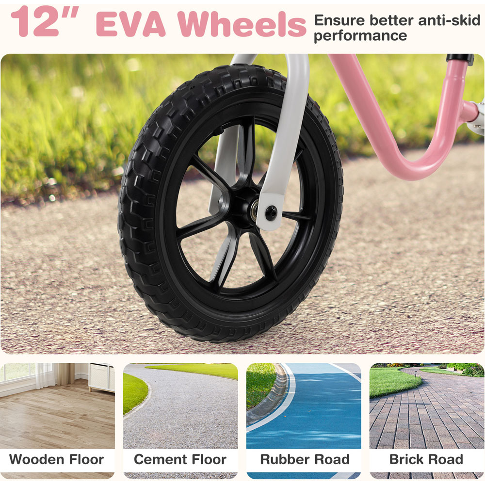 Let young riders discover confidence and coordination with a pink 12 inch balance bike designed for growing toddlers. It features an adjustable handlebar and seat for a custom fit as they master their balance. Non-slip handlebars and an 80° steering limit keep every ride safe. Lightweight construction and anti-skid EVA wheels let children enjoy smooth adventures indoors or outdoors. Built for children over three years old, this no pedal training bike encourages muscle strength, balance and motor skills, making it a thoughtful gift for little ones ready to explore.