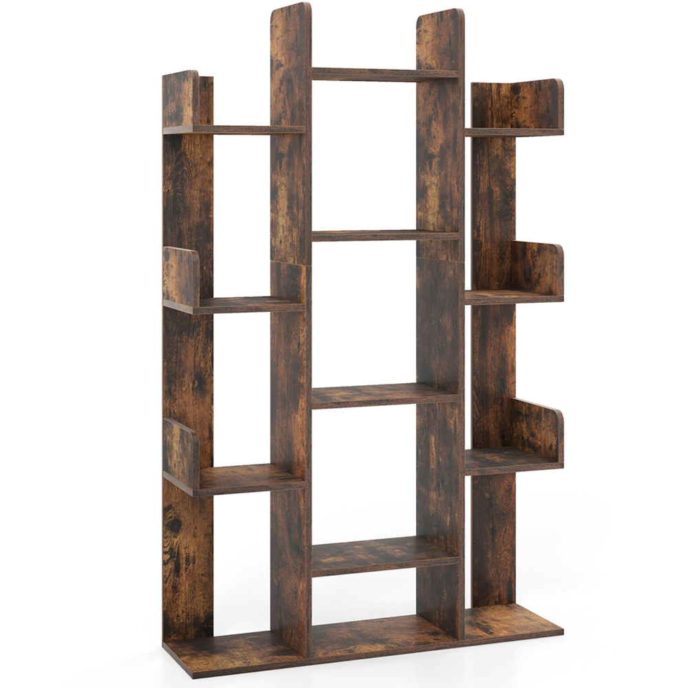 Showcase your beloved books and treasures on this uniquely designed Costway 13 Shelf Rustic Brown Tree Bookcase. It not only maximises your space with its clever corner fit but also brings a rustic aesthetic charm to any room. Resembling the silhouette of a tree, this bookshelf adds a novel and artistic dimension to your home or office decor. With 13 open shelves, it provides ample space to display books, collectables, and other decorative items. The structure is enhanced with a sturdy base, non-slip foot pads, and anti-toppling kits, ensuring it is both safe and durable for long-term use.